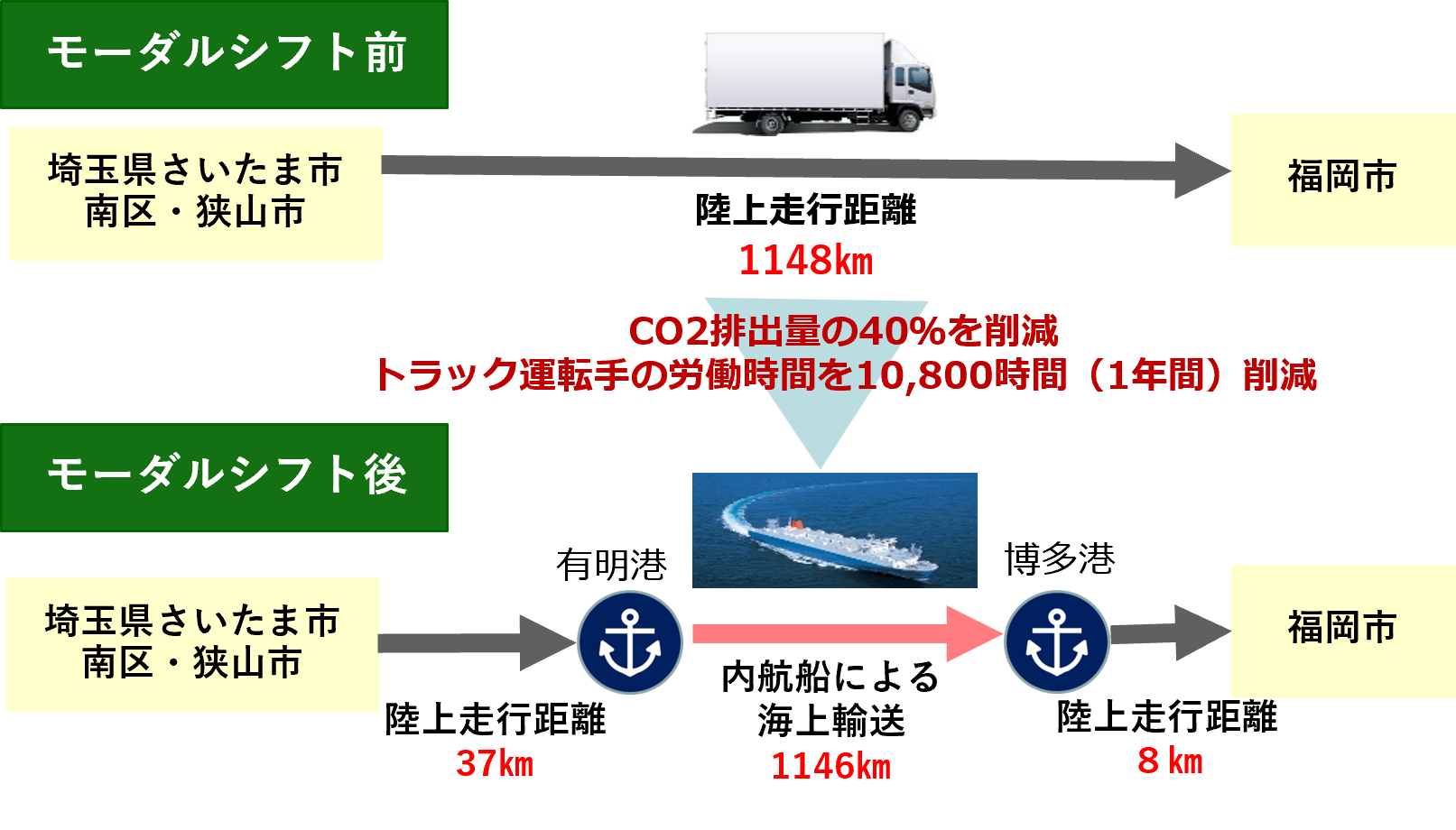 ロッテの埼玉県(さいたま市・狭山市)から福岡県(福岡市)への製品輸送において、㈱曙運輸と協調し、トラック輸送からフェリーを活用しこれまで1148kmであった陸上走行距離を、港までの陸上輸送(37kmおよび8km)と内航船による海上輸送(1146km)に転換しました。本取り組みにより、CO2排出量の40%削減と、トラック運転手の労働時間10,800時間(年間)の削減につながりました。