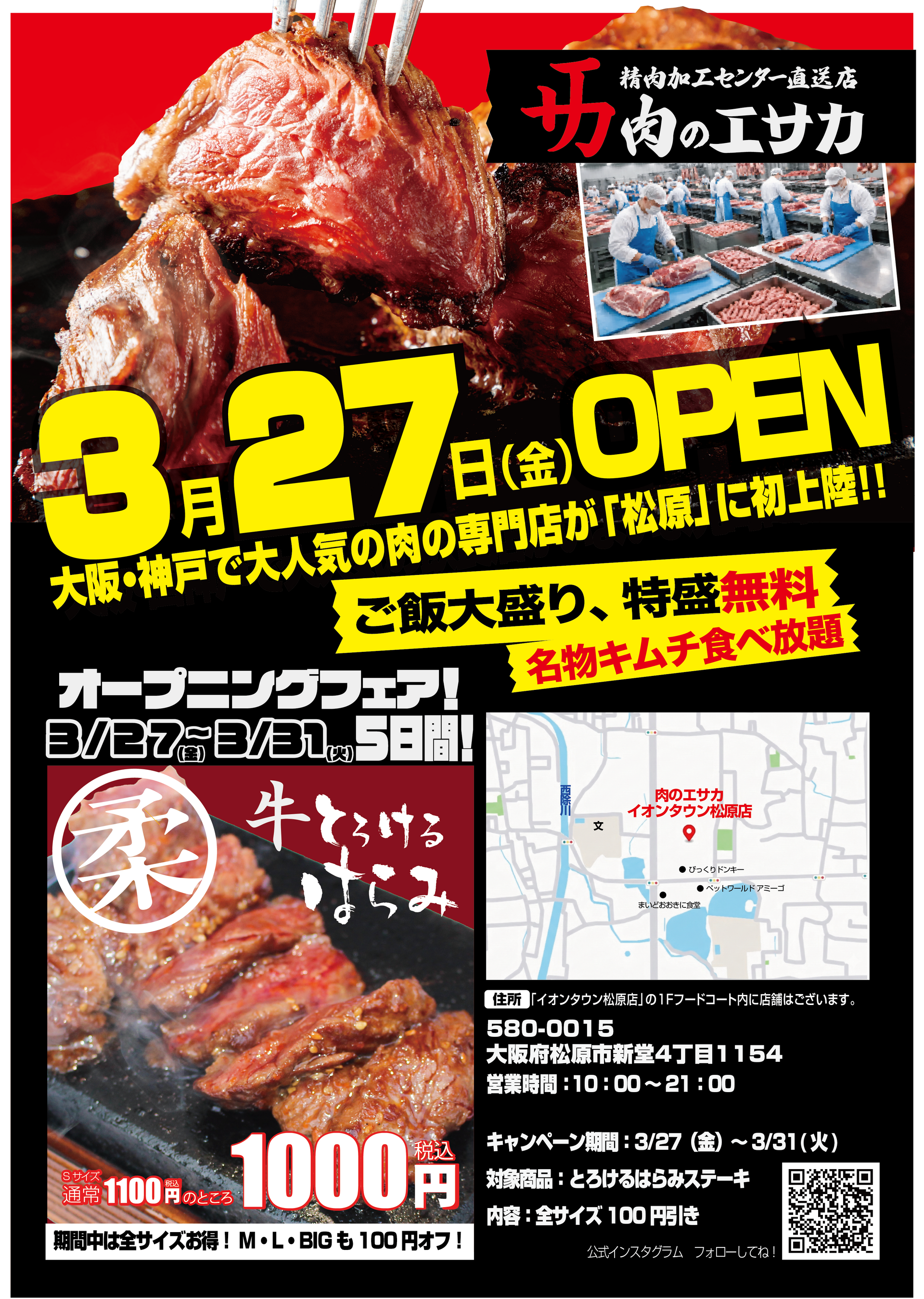 飲食店の運営・開発を行う株式会社C-HUNDRED(所在地:大阪府大阪市北区)は、「肉のエサカ イオン松原店」を3月27日に大阪府松原市にグランドオープンいたします。