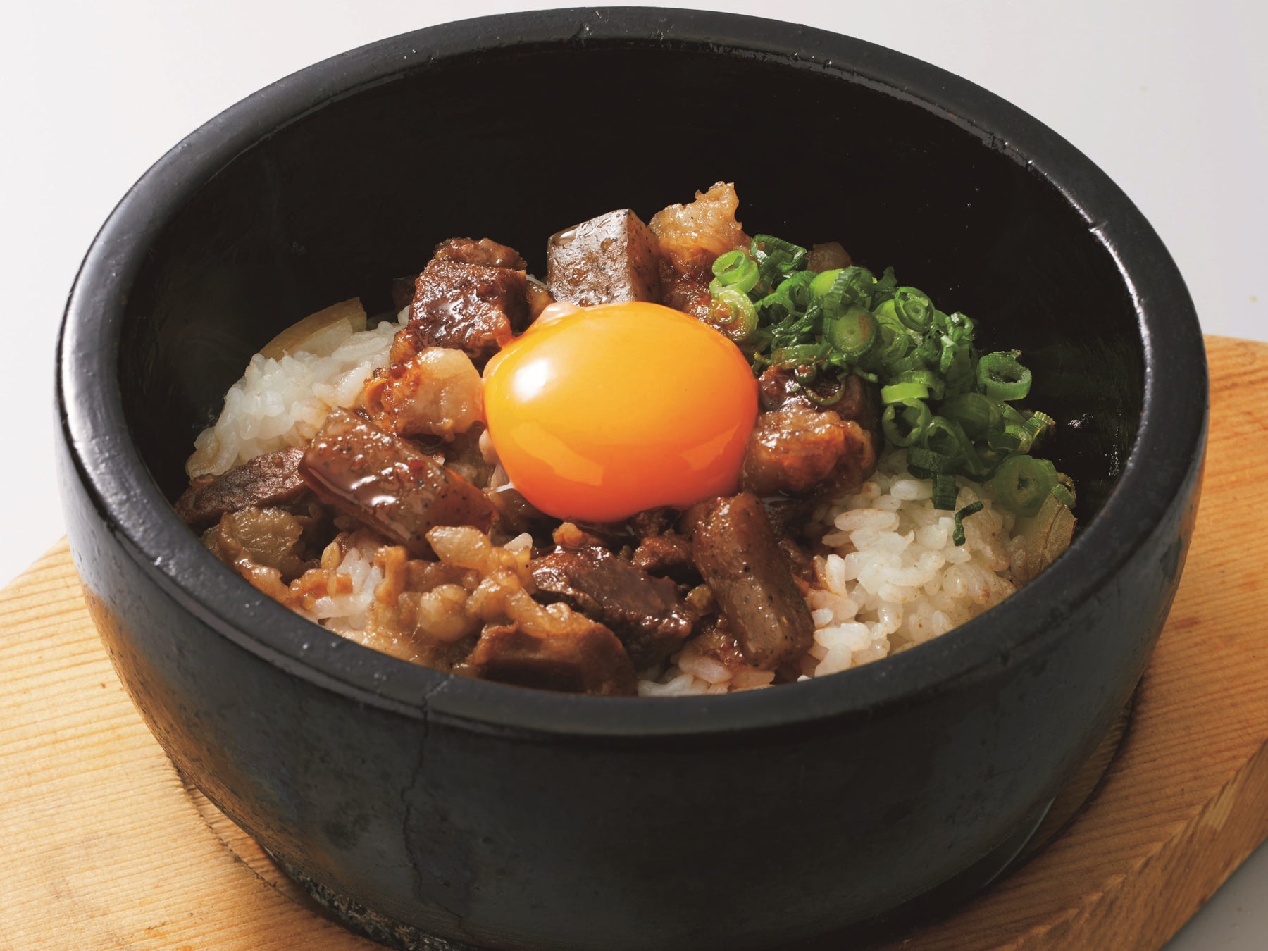 熱々の石鍋に盛ったご飯の上に、旨味たっぷりの牛すじぼっかけと濃厚な卵黄をトッピングし、香ばしいおこげがたまりません。
