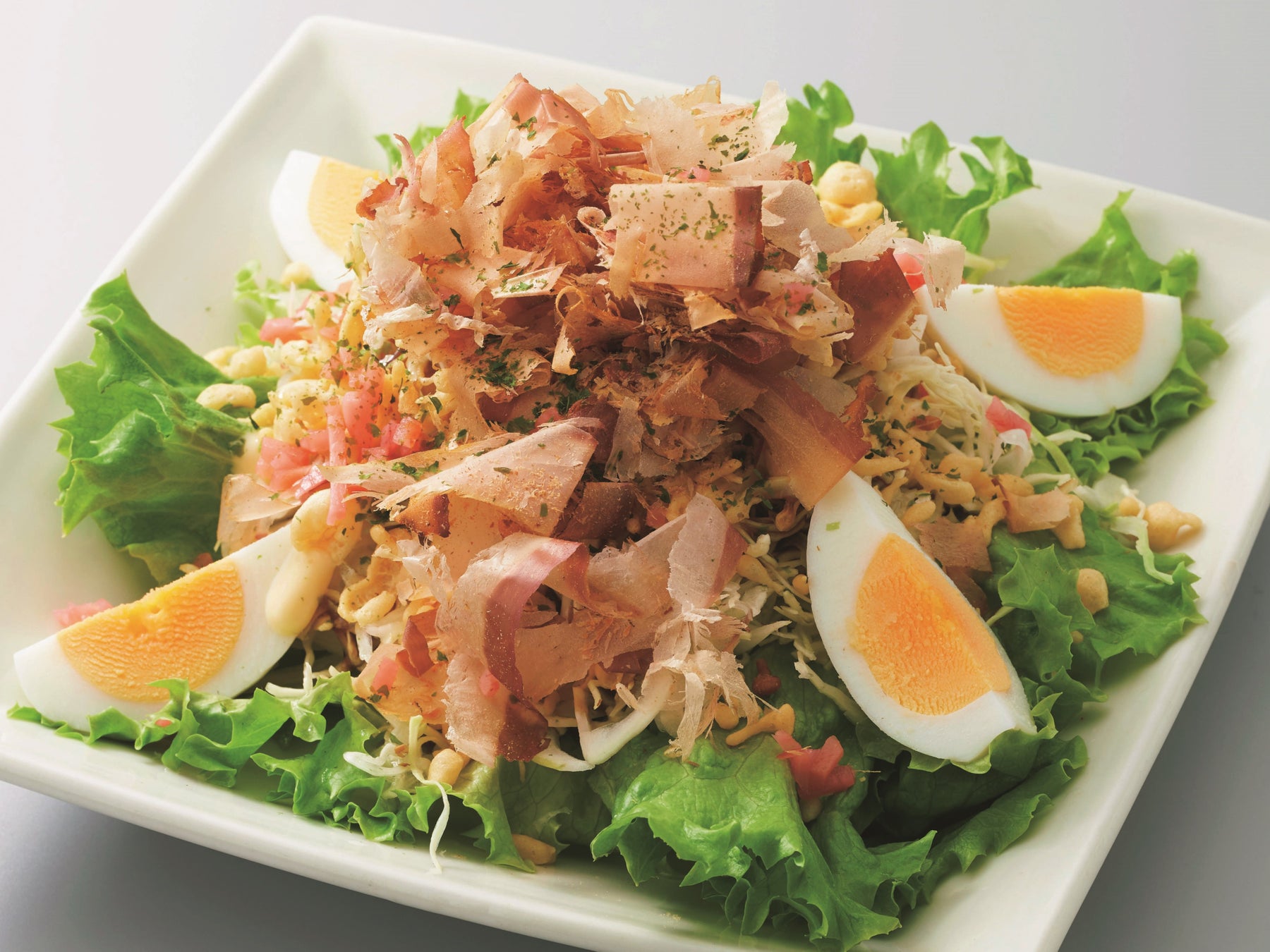 シャキシャキ野菜に、いか入り天かすのコクと旨味をプラス。マヨネーズ、花かつお、紅生姜、青のりをトッピングし、ソースを使った特製お好みドレッシングで仕上げました。まるでお好み焼きのような味わいが楽しめる一品です。