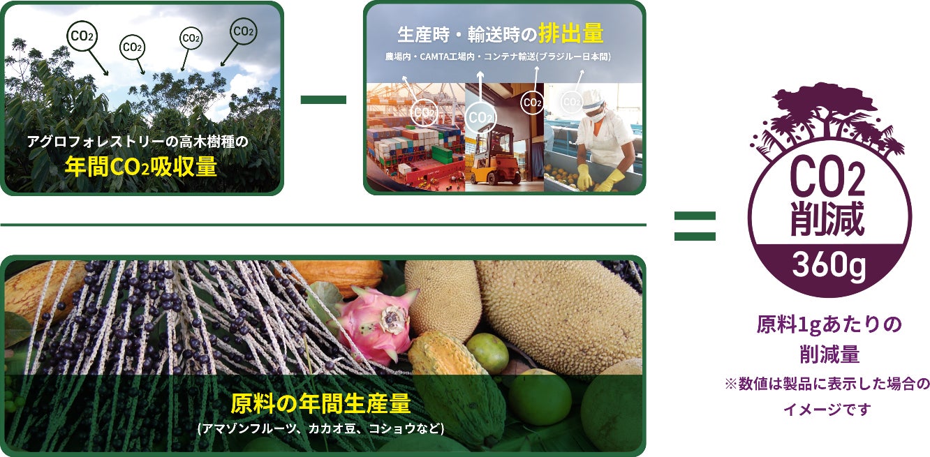 なお、製品パッケージには、アサイーが栽培されているアグロフォレストリー農法のCO2吸収量を1製品あたりの削減量として換算した「CO2削減マーク」が表示されています。本製品の場合は1本あたりで9gのCO2削減となります。日常の中で「おいしい」を選ぶことでブラジルアマゾンの森を守る確かな一歩になる。そんな心まで満たされるサスティナブルな食体験を、ぜひお楽しみください。