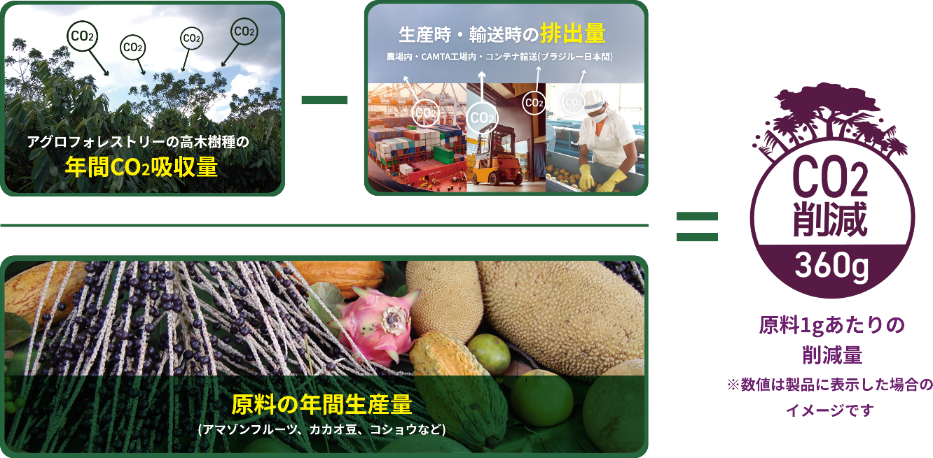 アグロフォレストリーのメリットのひとつに、「温室効果ガス」の一種であるCO2の吸収があります。削減マークの数値は、CAMTAの組合員のアグロフォレストリー農場の高木樹種が吸収したCO2から、ブラジルにおける生産や日本までの輸送時に排出されたCO2を引き、原料の生産量で割った1gあたりの数値を、製品に配合された原料の使用量に応じて削減量として算出しています(いずれも年間ベース)。算出根拠は、農場面積や生産量、CO2排出量の増減により変化します。