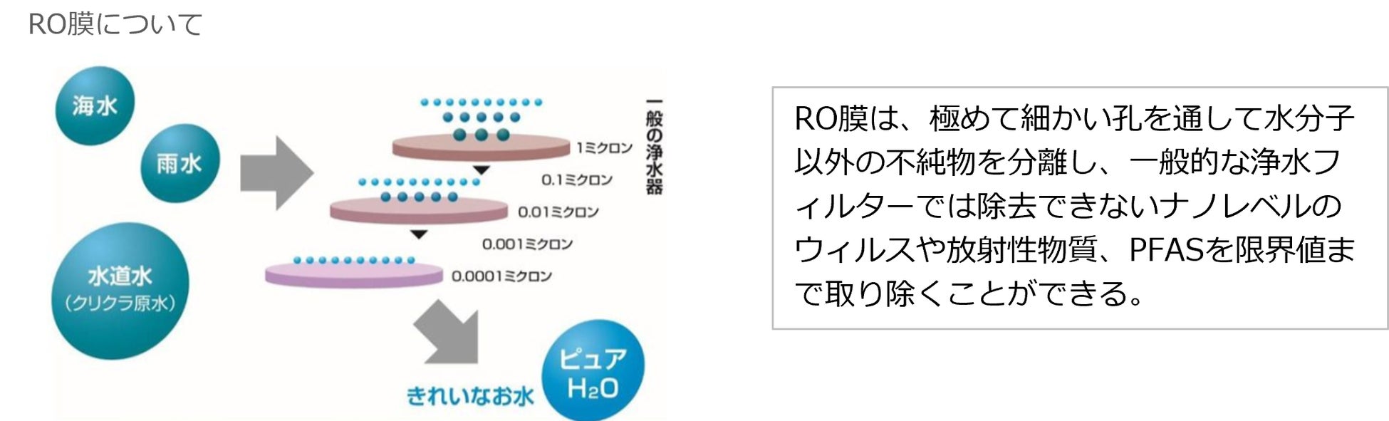 クリクラの水は、厳しい水質基準をクリアした日本の水道水を原水に採用し、RO(逆浸透膜)フィルターにより不純物やPFASなどの化学物質を取り除き、水の純度を高めたRO水です。