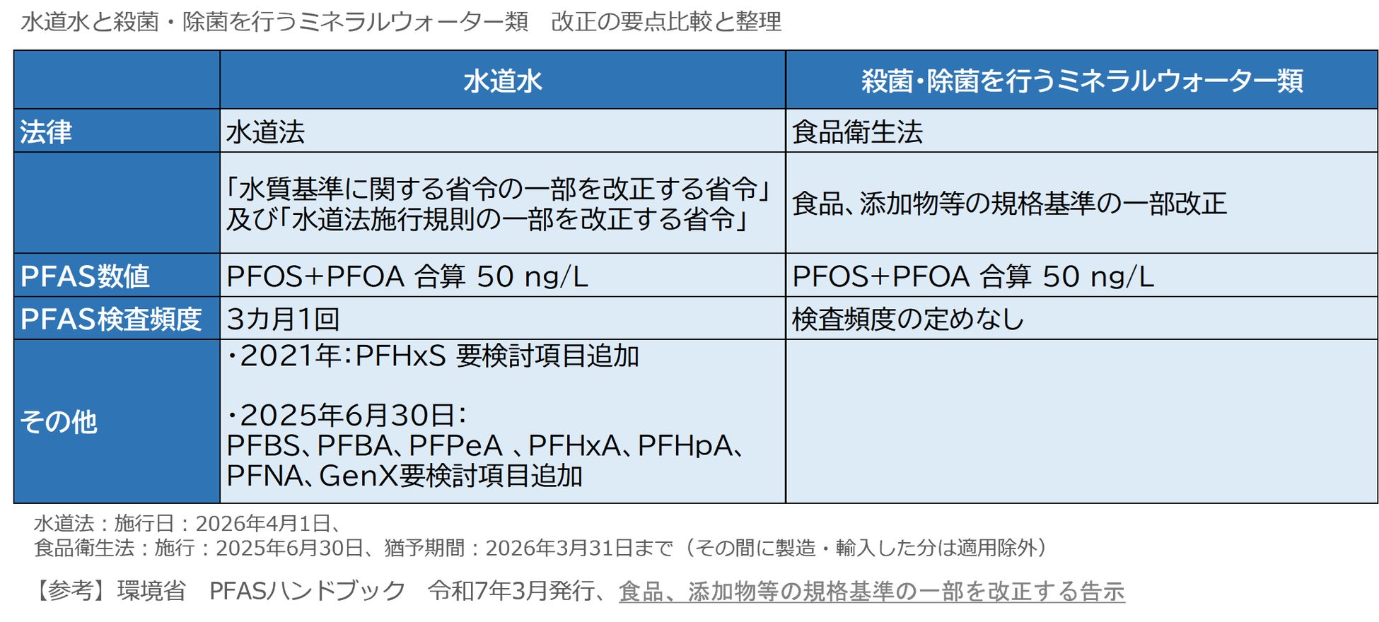 ・殺菌・除菌を行うミネラルウォーター類も、食品衛生法改正によりPFASの基準が新たに整備