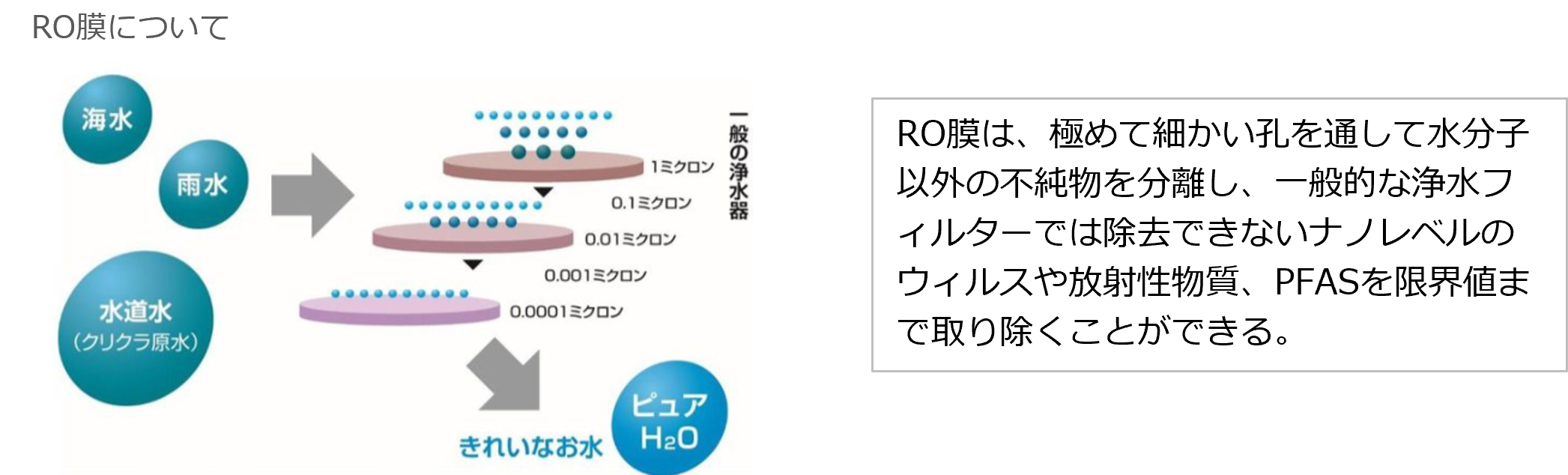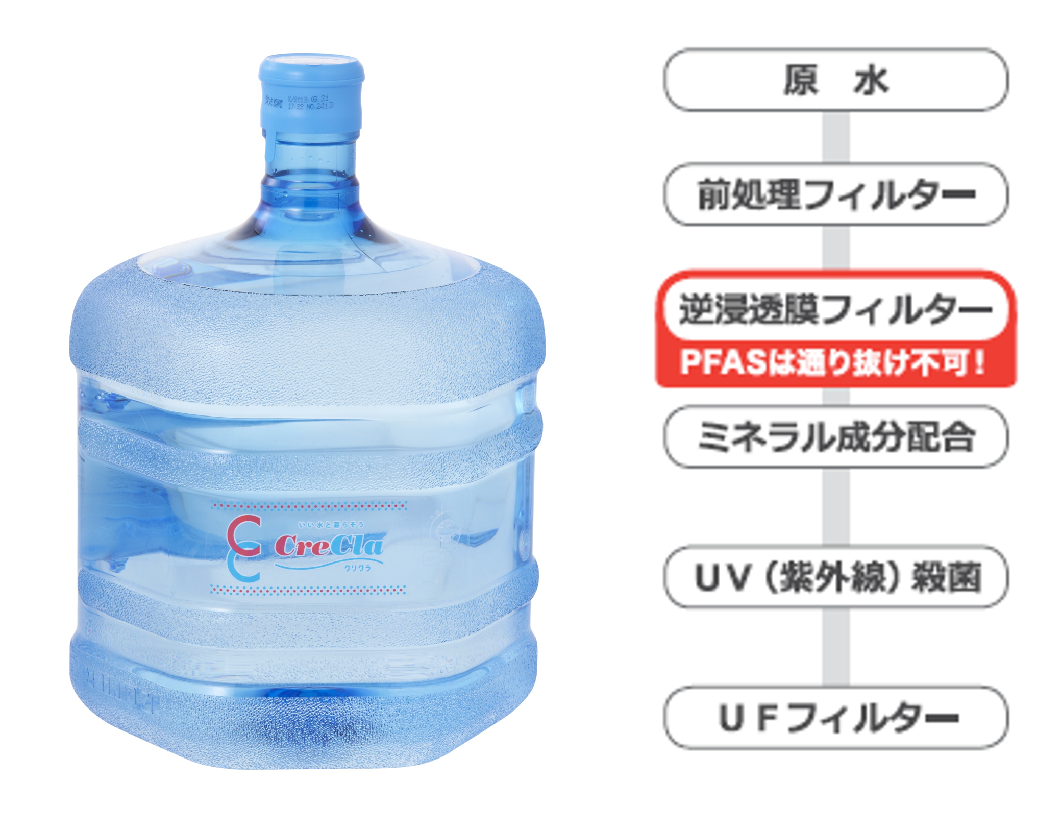 クリクラの水は、厳しい水質基準をクリアした日本の水道水を原水に採用し、RO(逆浸透膜)フィルターにより不純物やPFASなどの化学物質を取り除き、水の純度を高めたRO水です。
