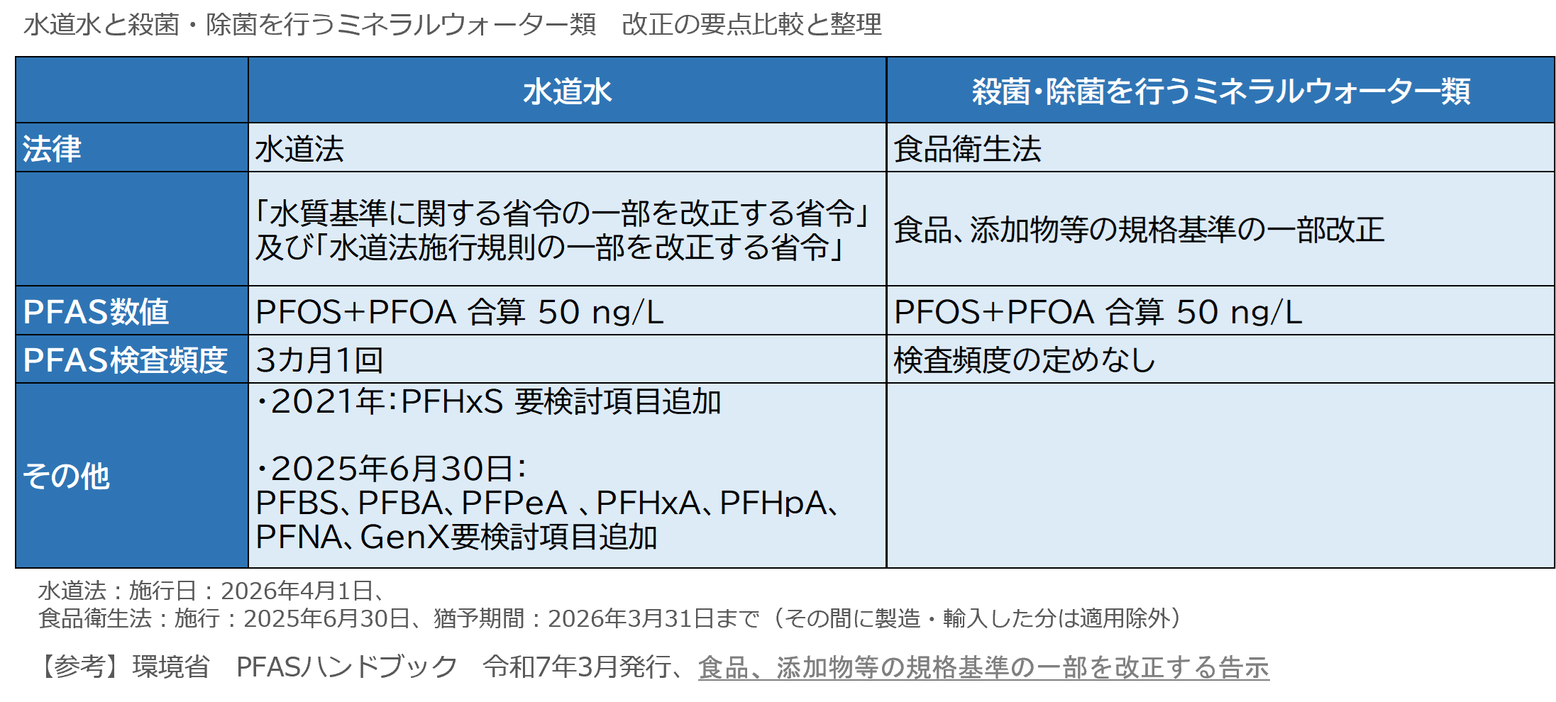 ・殺菌・除菌を行うミネラルウォーター類も、食品衛生法改正によりPFASの基準が新たに整備