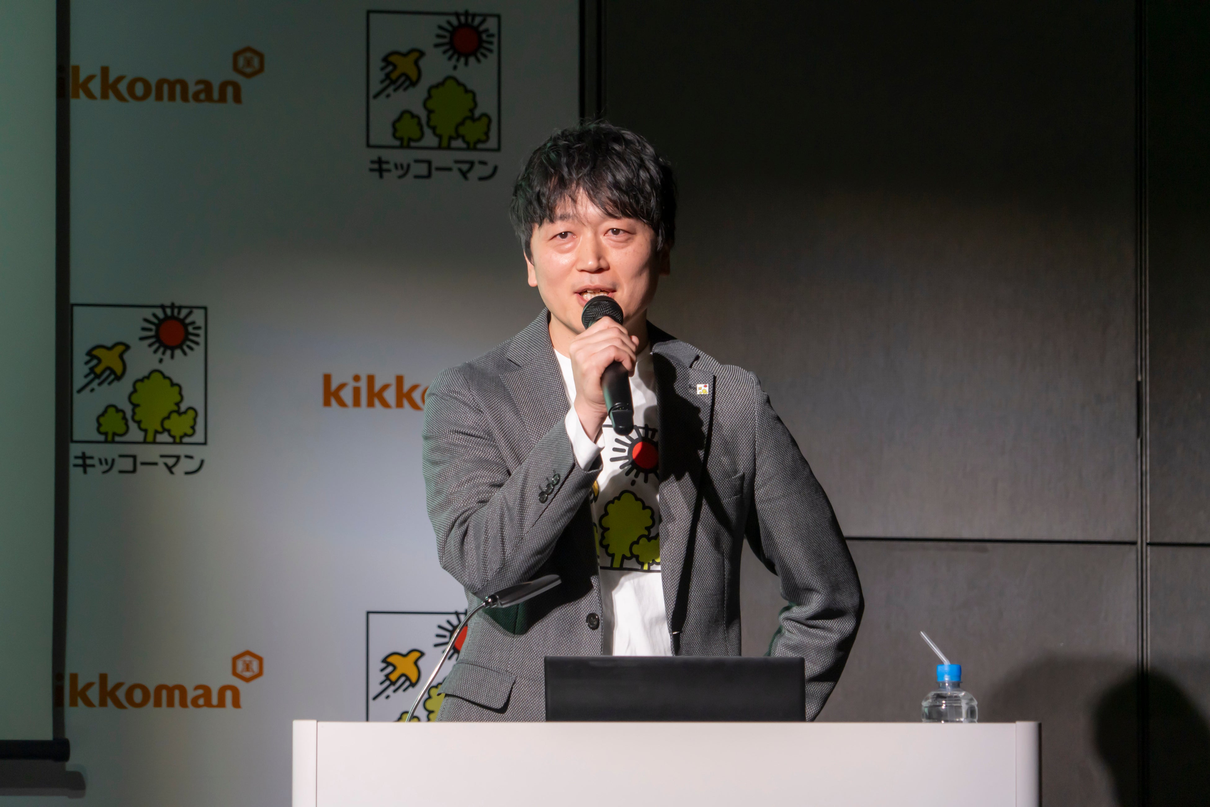 はじめに、キッコーマンソイフーズ株式会社 マーケティング本部 マーケティング推進部長 亀井淳一が2026年度の事業戦略についてプレゼンテーションを実施。近年の健康志向の高まりや、たんぱく質摂取意識の上昇を背景に、豆乳市場は拡大傾向にあり、生産量は過去最高水準に達していることを説明しました。