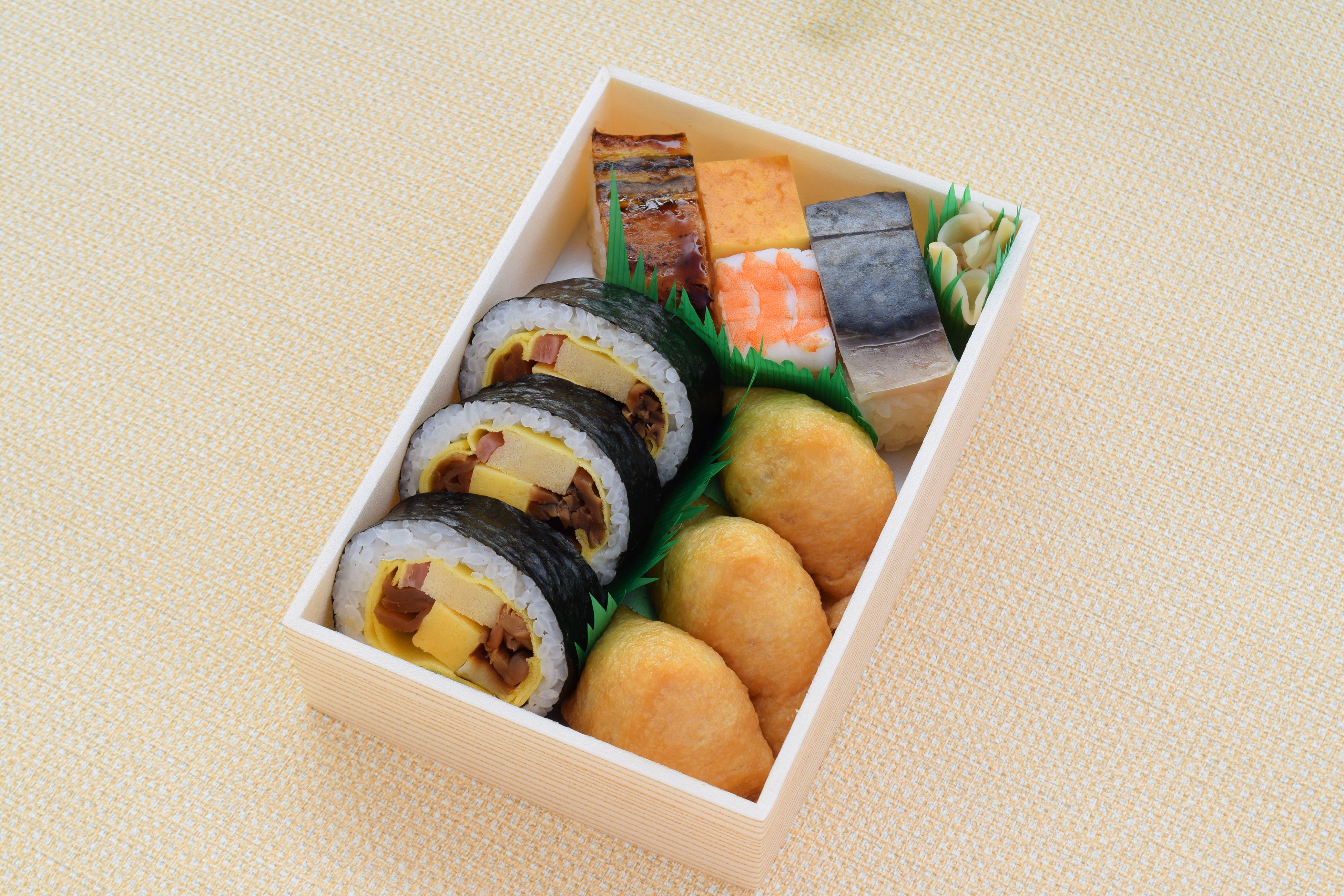 ◯商品内容:太巻(笑福巻)、押寿司(穴子、海老玉、バッテラ)、こいなり(金ごま)