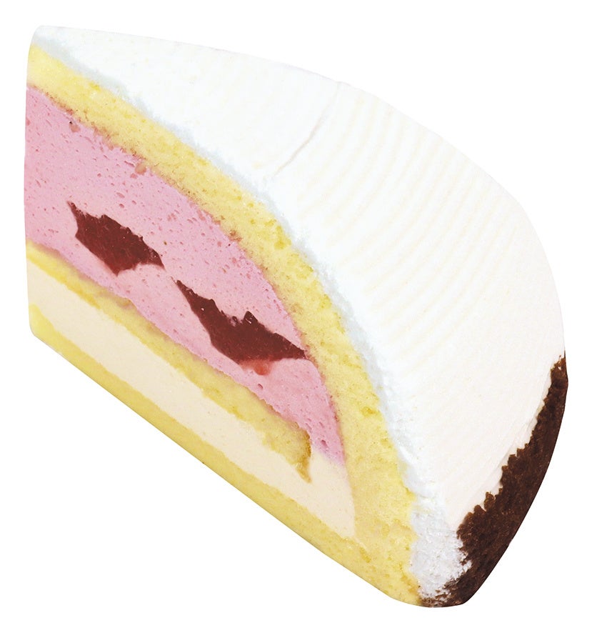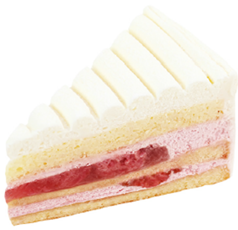 軽いタイプのカスタードクリーム、苺ソース入りの苺クリームをスポンジでサンドし、表面は練乳入りシャンテリークリームで仕上げました。苺の甘酸っぱさが楽しめる白いボンブ型のショートケーキです。