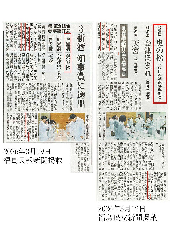 福島県春季鑑評会(令和8年度)において、奥の松酒造は「吟醸酒の部 県知事賞」および「純米酒の部 金賞」の二部門で受賞いたしました。
