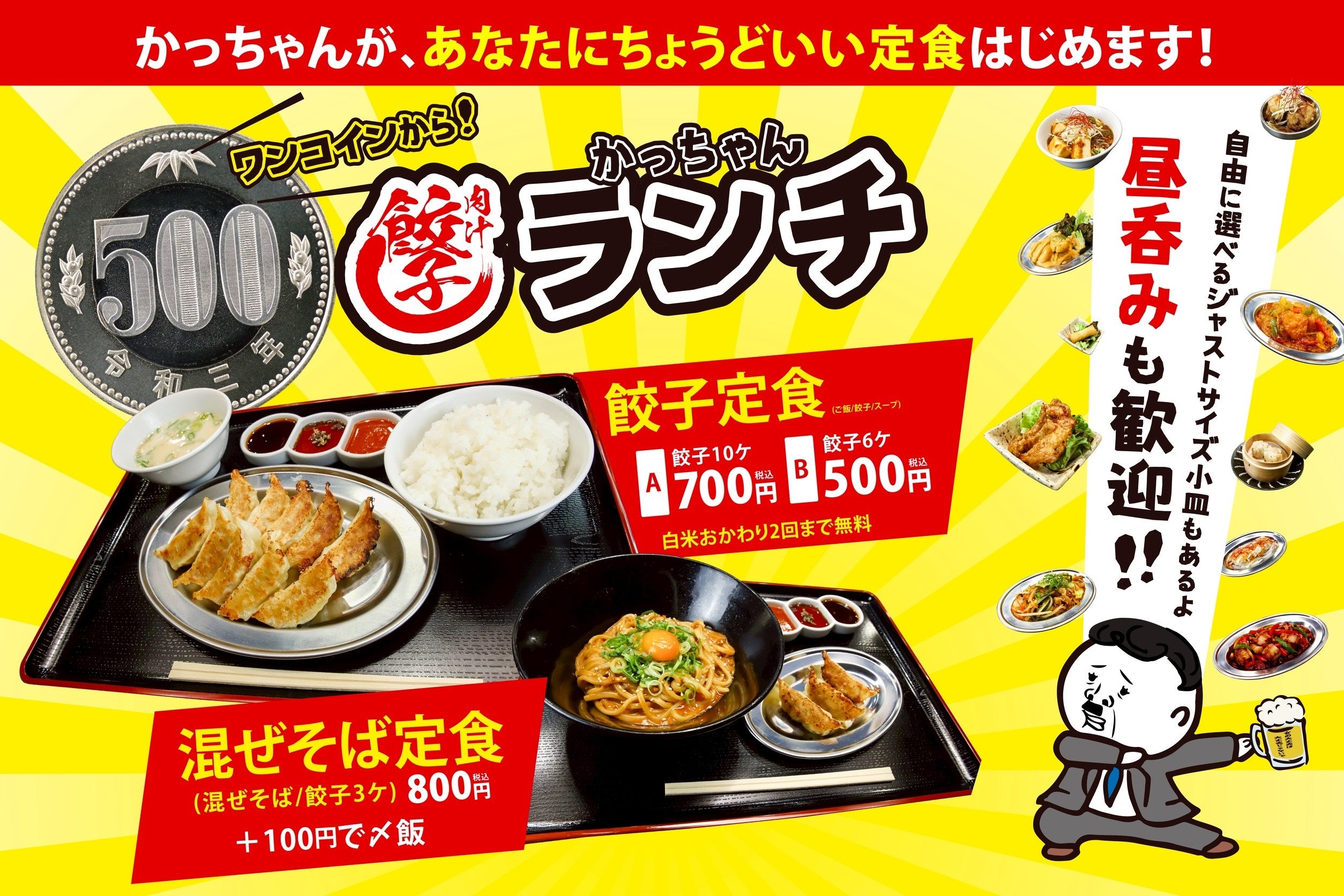 この閉塞状況を打破するため、「餃子のかっちゃん」はあえてこの時代に、ワンコインでお腹いっぱいになれる定食メニューをご用意しました。節約志向が高まる中でも、妥協することなく、温かくて美味しい食事で午後の活力をチャージしていただきたいという想いを込めています。