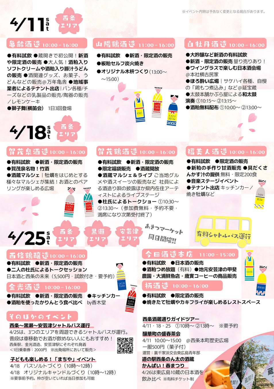※上記の日以外も酒蔵巡りを楽しんでいただけます。また、関連イベントの開催も予定されています。