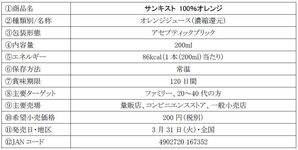 「サンキスト 100%オレンジ」は、日本では1976年に初めて発売し、長年ご愛顧いただいてきた当社の定番果汁飲料商品です。このたび容器およびパッケージデザインを一新し、約2年ぶりに販売いたします。
