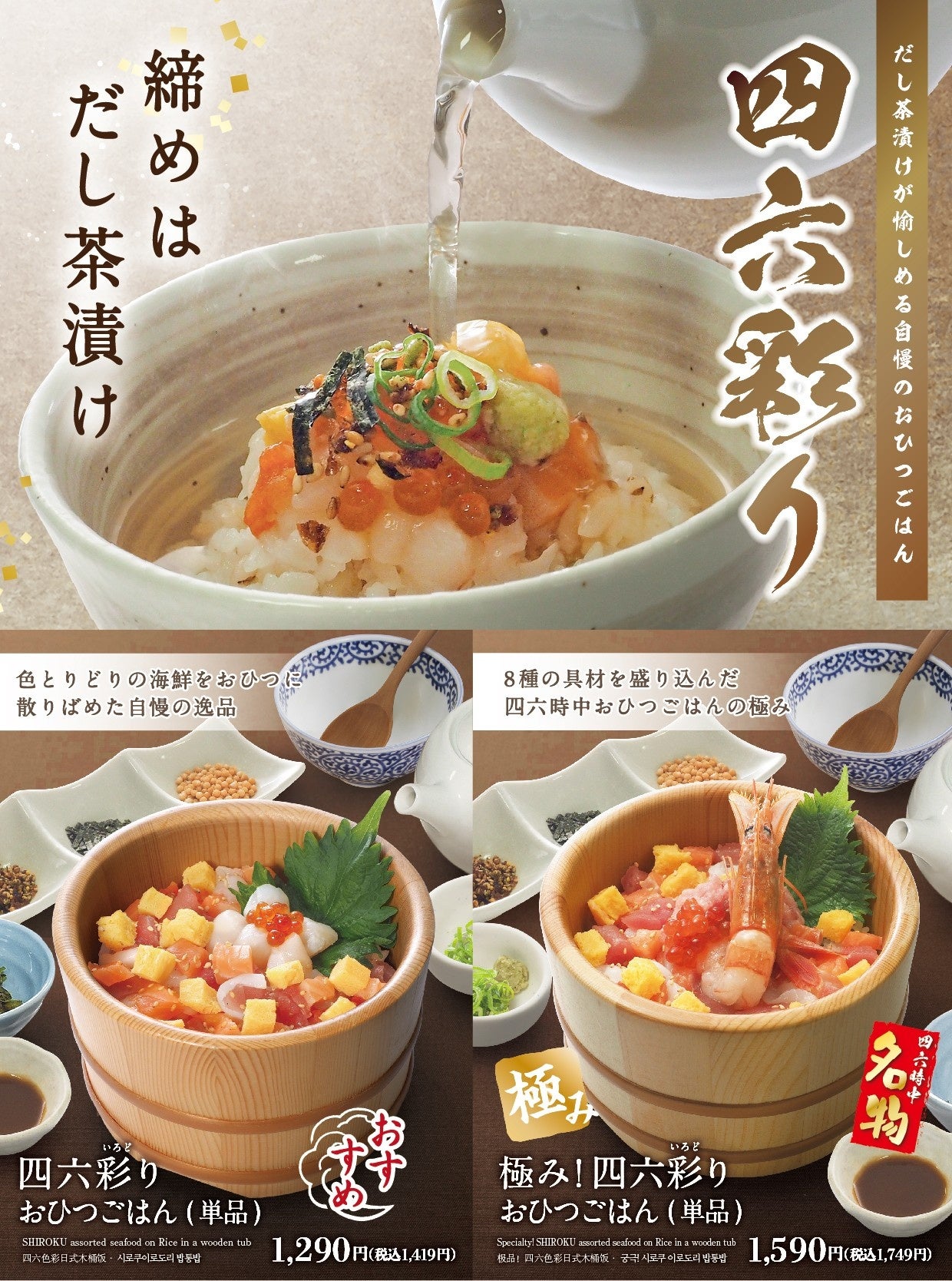 当社は、日本最大のだし茶漬け専門チェーン『おひつごはん四六時中』のブランド価値向上とさらなる拡大に向け、立地に合わせたメニューやサービス改善に取り組み、お客さま満足度の向上を図っております。このたび、その一環として、イオンモール川口前川店の『おひつごはん四六時中 川口前川店』をリニューアルし、若年層からファミリー層まで幅広いお客さまに“だし茶漬け”の魅力をより感じていただける店舗へと刷新いたします。今回のリニューアルでは、館内でも特に人通りが多くカフェ利用のニーズが高い特性を踏まえ、開放感がありながら落ち着いて過ごせるオープンスタイルへと改装し、より立ち寄りやすい雰囲気を高めます。さらに“だし茶漬け”や“和スイーツ”をより印象的に伝えるショーウィンドウへと一新するとともに、什器やお盆・カトラリーを木目調に統一することで温かみのある雰囲気を演出してまいります。メニューにつきましては、お客さまが“自分流のおひつごはん”をより自由に楽しめるよう、従来のおひつ専用のオリジナルタレに加えバジルチーズソースや海老みそソースなど全5 種類のタレからお好みで選べるスタイルへ変更いたします。また、“だし茶漬け”には欠かせない薬味として、刻み海苔やあられの他に特製だしの旨味を一層引き立てる“おかか”を新たに取り入れ、これまでだし茶漬けに馴染みの薄かった若い世代の方にも興味をもっていただけるように見直しを図っております。