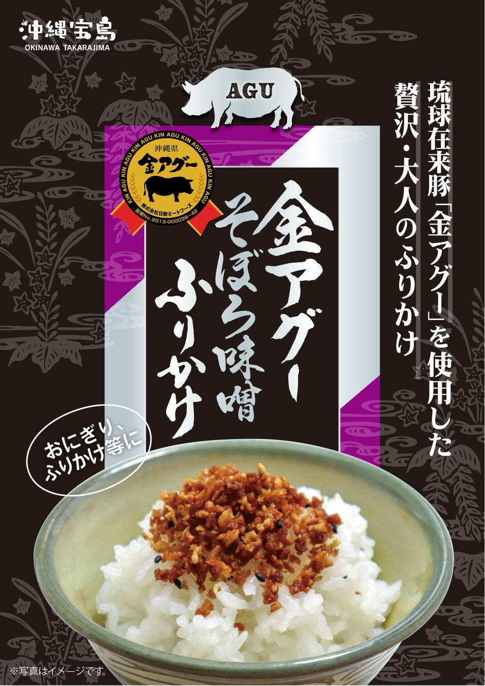 琉球在来豚「アグー」の証明を受けている「金アグー」を使用した沖縄のご当地ふりかけ。脂身がさっぱりして、豚特有の臭みの少なさが特徴の金アグーを贅沢に使用。アグーの味わいと味噌がバランスよくからみ合う、贅沢・大人のふりかけ。