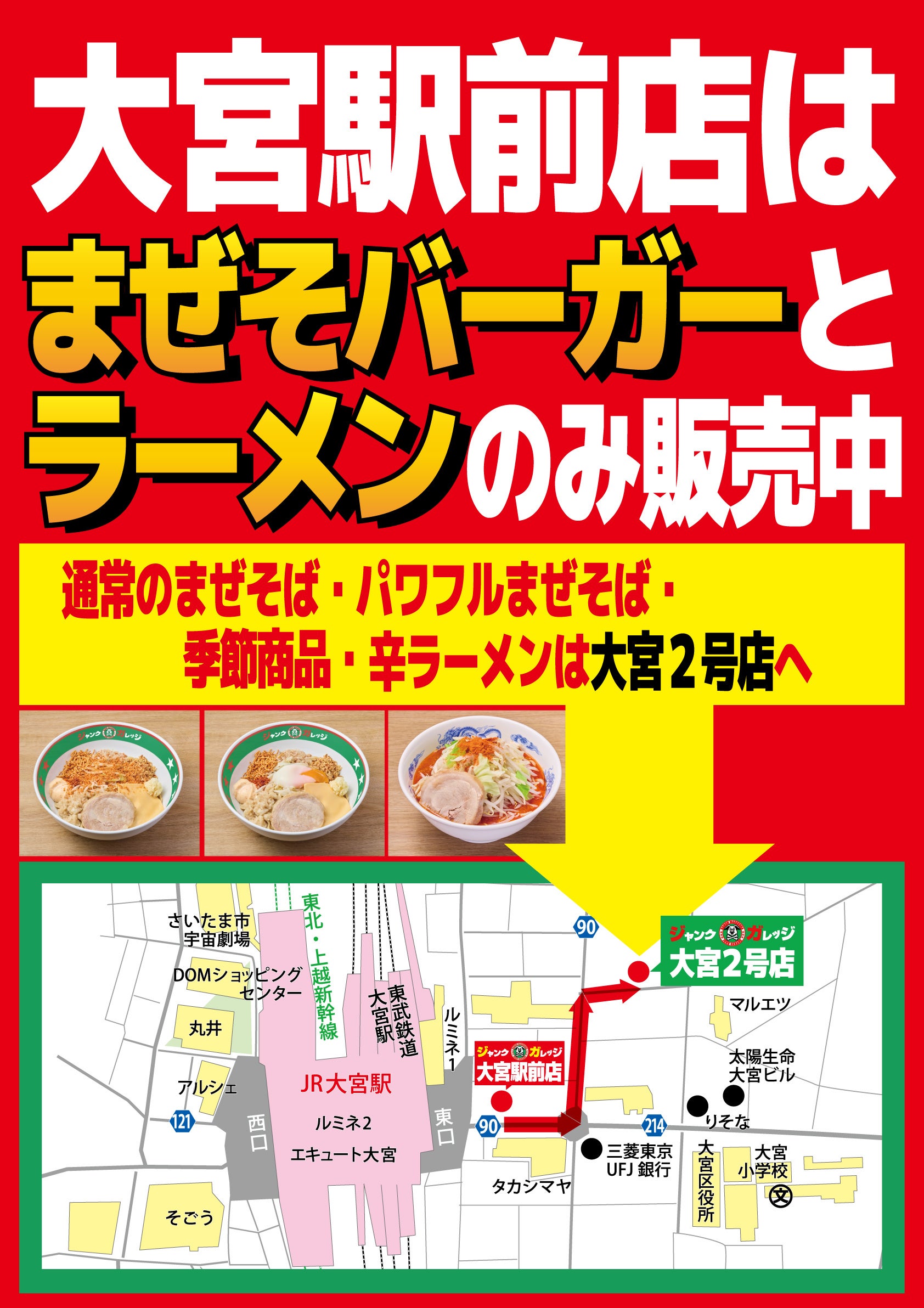 「いつものジャンクガレッジのまぜそばが食べたい」というお客様には、大変恐縮ながら近隣の「ジャンクガレッジ 大宮2号店」をご案内させていただきます。期間中は「新作の大宮駅前店」「定番の大宮2号店」として、その日の気分に合わせて使い分けていただければ幸いです。