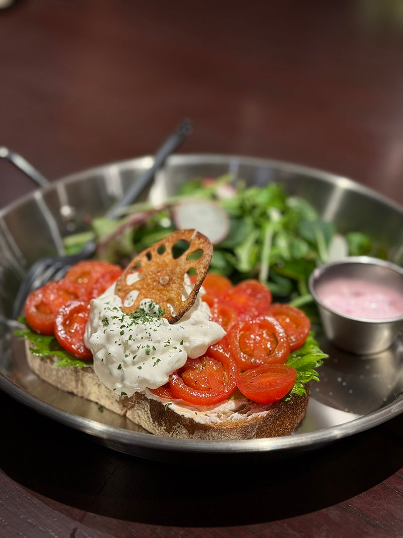 オープンサンドには岡山県産の濃厚なフルーツトマト「せとうちルビー(せとうち農園)」をたっぷりトッピング。甘酸っぱいトマトのおいしさがヨーグルトソースと絶妙にマッチします。さらに、倉敷市連島地区の特産品である「連島れんこん」のチップを添えて、地元野菜のおいしさを存分にお楽しみいただけます。