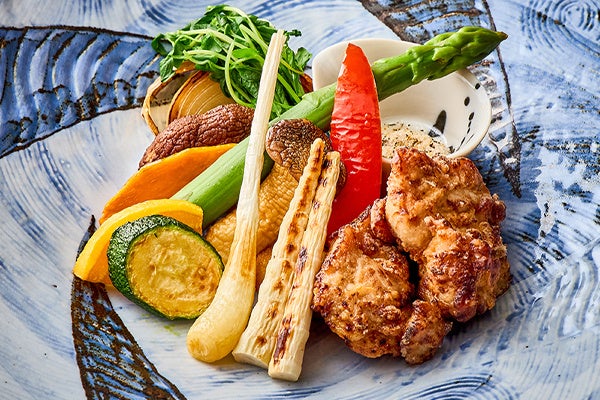 四季彩ランチでは、メインディッシュを旬香自慢の鉄板焼き、炭火焼きなどで調理した6種類からお選びいただけます。中でも『月替わりの炭火焼き(¥3,500)』では、毎月異なる旬の彩り野菜をご提供いたします。5月1日(金)~31日(日)は、鞘ごと炭火で焼いて柔らかさと甘みが増した旬の“ヤングコーン”と、シャキシャキとした食感と爽やかな辛み、ほのかな甘みが特徴の新生姜を豚バラ肉で巻いた“豚バラ肉の新生姜巻き”をご堪能ください。6月2日(火)~30日(火)は、焼くことで本来の風味と甘みが引き立ち、素材本来の優しい味わいを楽しめる“五三竹”をご用意いたします。柔らかくジューシーな鹿児島県の銘柄鶏“さつま雅”の唐揚げと一緒にご賞味ください。