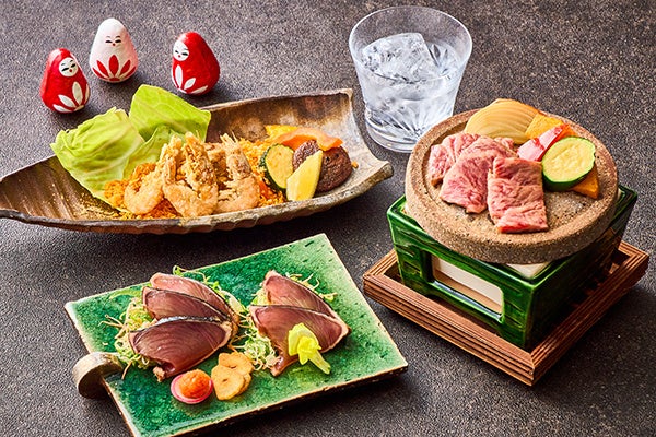 鹿児島県産の”鰹節”から取った、風味豊かな澄んだ出汁を野菜と一緒に固めた上品な味わいのゼリー寄せや、さつま揚げにたこを混ぜ込み手でちぎったような形に揚げた“たこのちぎり揚げ”、鹿児島特有の濃厚で甘みの強い醤油に漬けたカマンベールチーズなど、前菜から鹿児島県の味を堪能いただけます。