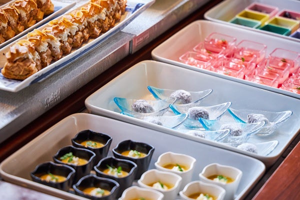 食後のデザートは、パティシエ特製デザートが6種類ビュッフェ台に並び、心ゆくまでお召し上がりいただけます。鉄板で仕上げる旬香自慢のふわふわな出来立てパンケーキも付いた大満足なセットです。