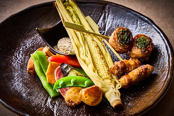 四季彩ランチでは、メインディッシュを旬香自慢の鉄板焼き、炭火焼きなどで調理した6種類からお選びいただけます。中でも『月替わりの炭火焼き(¥3,500)』では、毎月異なる旬の彩り野菜をご提供いたします。5月1日(金)~31日(日)は、鞘ごと炭火で焼いて柔らかさと甘みが増した旬の“ヤングコーン”と、シャキシャキとした食感と爽やかな辛み、ほのかな甘みが特徴の新生姜を豚バラ肉で巻いた“豚バラ肉の新生姜巻き”をご堪能ください。6月2日(火)~30日(火)は、焼くことで本来の風味と甘みが引き立ち、素材本来の優しい味わいを楽しめる“五三竹”をご用意いたします。柔らかくジューシーな鹿児島県の銘柄鶏“さつま雅”の唐揚げと一緒にご賞味ください。