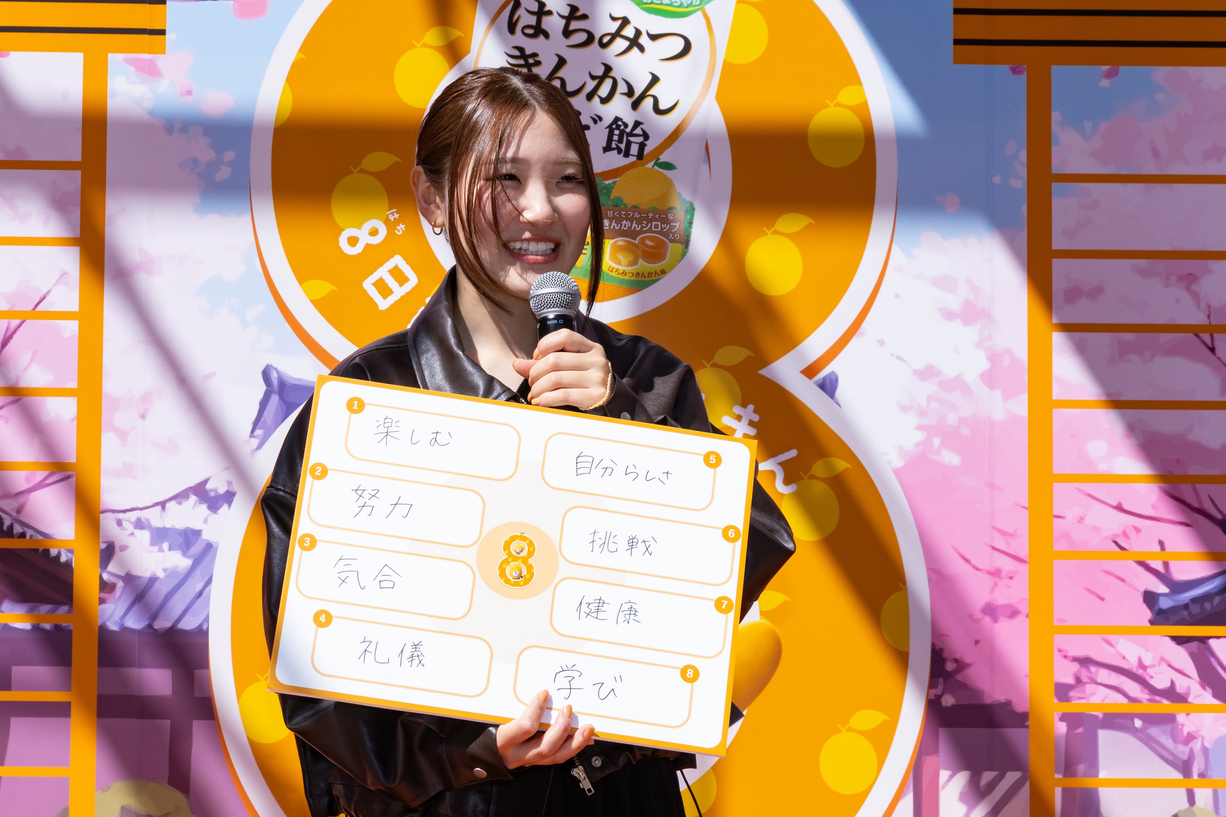 “小野選手流の新生活で大事だと思う要素”をはちきんの“はち”に絡めて“8つ”発表していただきました。挙げられたのは「①楽しむ ②努力 ③気合 ④礼儀 ⑤自分らしさ ⑥挑戦 ⑦健康 ⑧学び」の8つ。