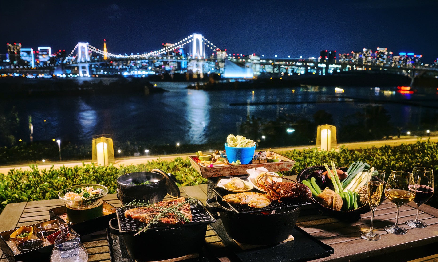 お台場 “世界最大級” の噴水「東京アクアシンフォニー」とともに 活伊勢海老やTボーンステーキを味わう 日本料理「さくら」テラス限定 炭火焼ペアコース登場