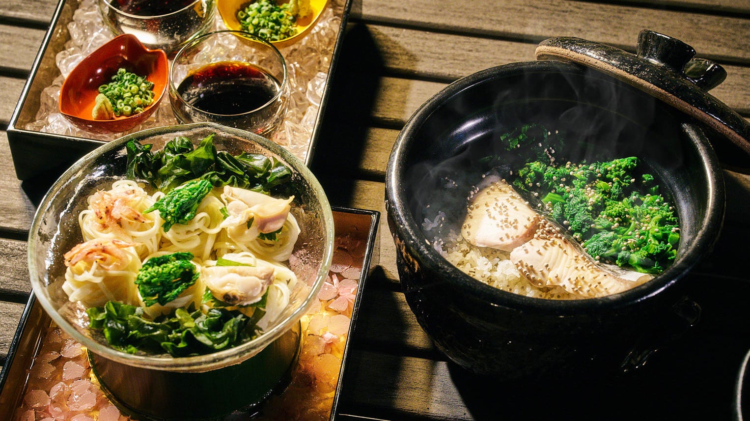 春の土鍋ご飯は、ふっくらとした身の鰆と菜の花を合わせ、隠し味に緑茶を加えた一品。料理人が一釜ずつ丁寧に炊き上げます。炊きたてならではの香りと旬の味わいをご堪能ください。また、滑らかな喉越しの稲庭うどんには、桜エビや蛤、生わかめなど、春に旬を迎える海の幸を合わせています。