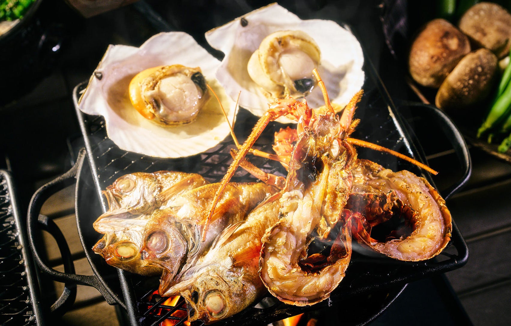 弾けるような食感の「活伊勢海老」や、塩胡椒のみでシンプルに味付けした豪快な「Tボーンステーキ」をお客様ご自身で炭火で焼き上げていただくコースです。旨味を凝縮させた「のどぐろの一夜干し」に加え、季節の新鮮野菜はお席にお持ちする盛り合わせから、お選びいただけます。