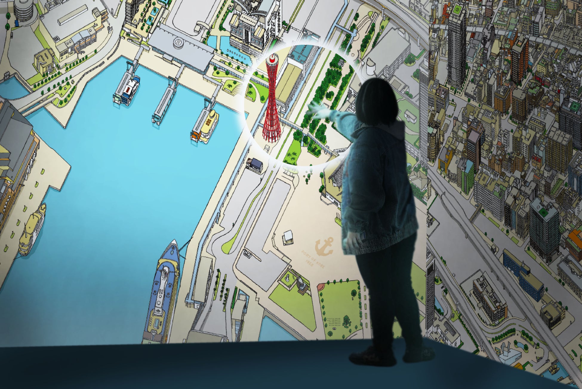 企画展1「不思議なチョコレート劇場~第2幕~」は昨年春に好評を博したインタラクティブなデジタルアートの展示が、より観覧者の参加性を高めたプログラムにバージョンアップして帰ってきました。第2幕は、チョコレートと神戸の街をテーマにした架空の劇場空間で、観覧者が主人公となって、自ら映像作品の動きに変化を起こす能動的なアート体験が可能に。自分だけのチョコを映像の上で作ったり、鳥瞰図絵師の青山大介さんが描く精緻な神戸の鳥瞰図を舞台にしたプログラムも登場。