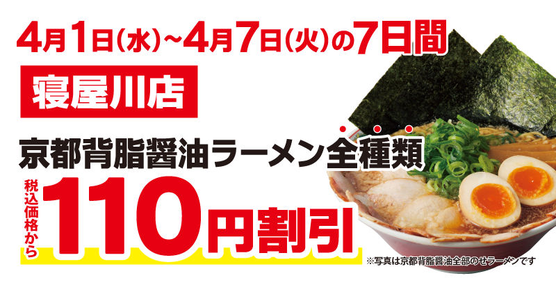 この度オープンを記念して、「寝屋川店」にご来店いただいたお客様には、『京都背脂醤油ラーメン全種類』を税込価格から110円割引で販売いたします。