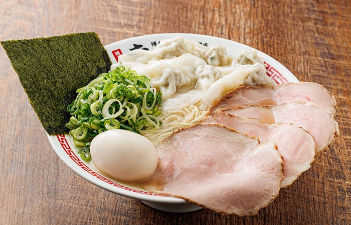 のり、味⽟、ワンタン、チャーシューをトッピングした、見た目も豪華で贅沢な一杯。