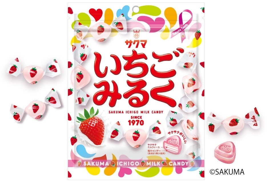 ミルキーピンクのいちごキャンディでサクサクのみるくミルフィーユを包んだ、画期的なクランチキャンディ。1970年生まれのロングセラー商品です。