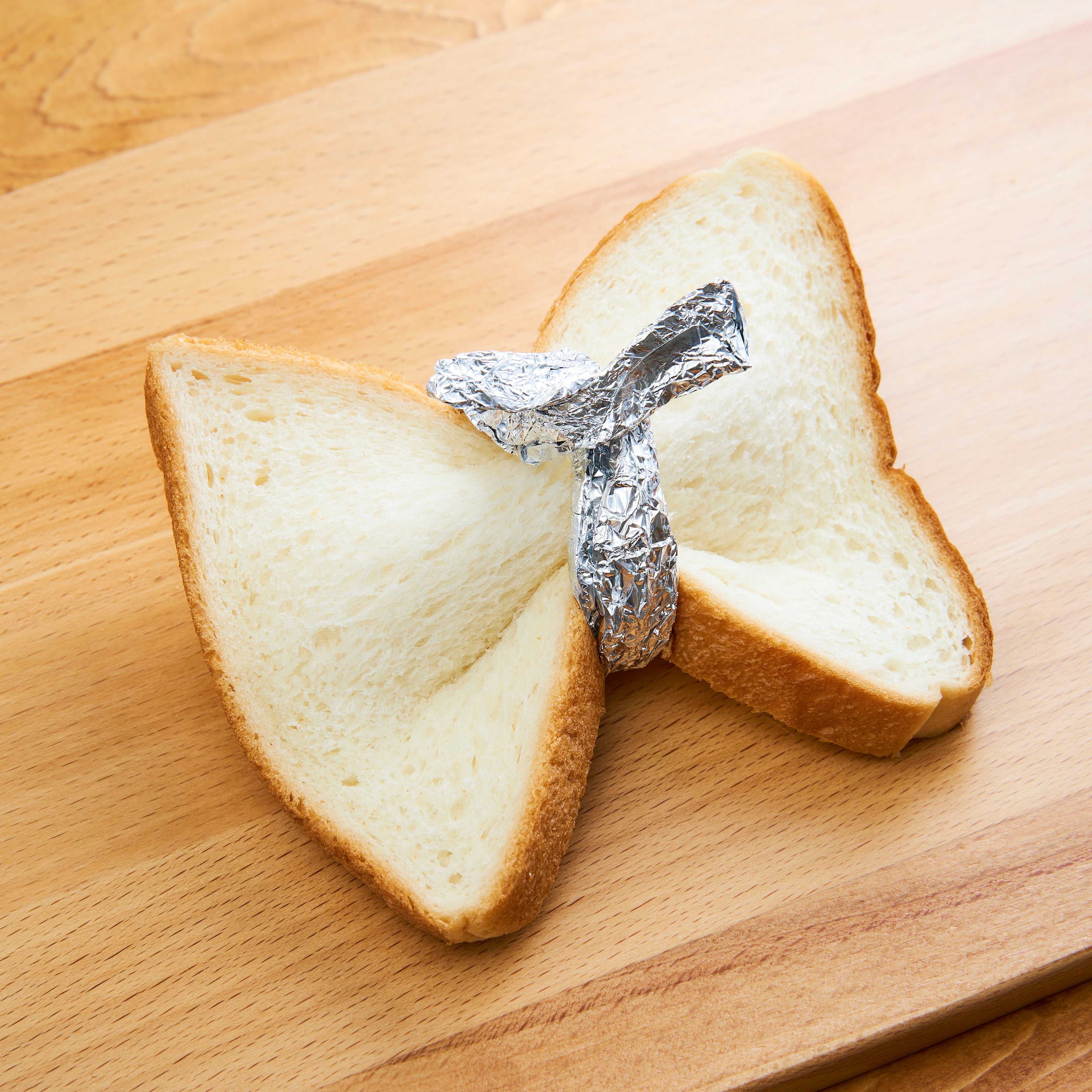 ① 食パンの真ん中をつまみ、帯状に丸めたアルミホイルで結んでリボン状に成形します。トースター(中温)で5分程度加熱し、焼き固めます。