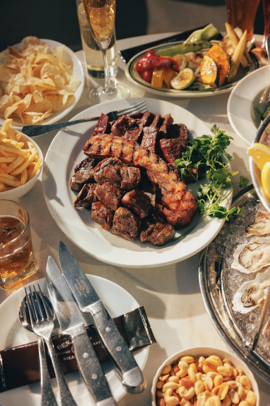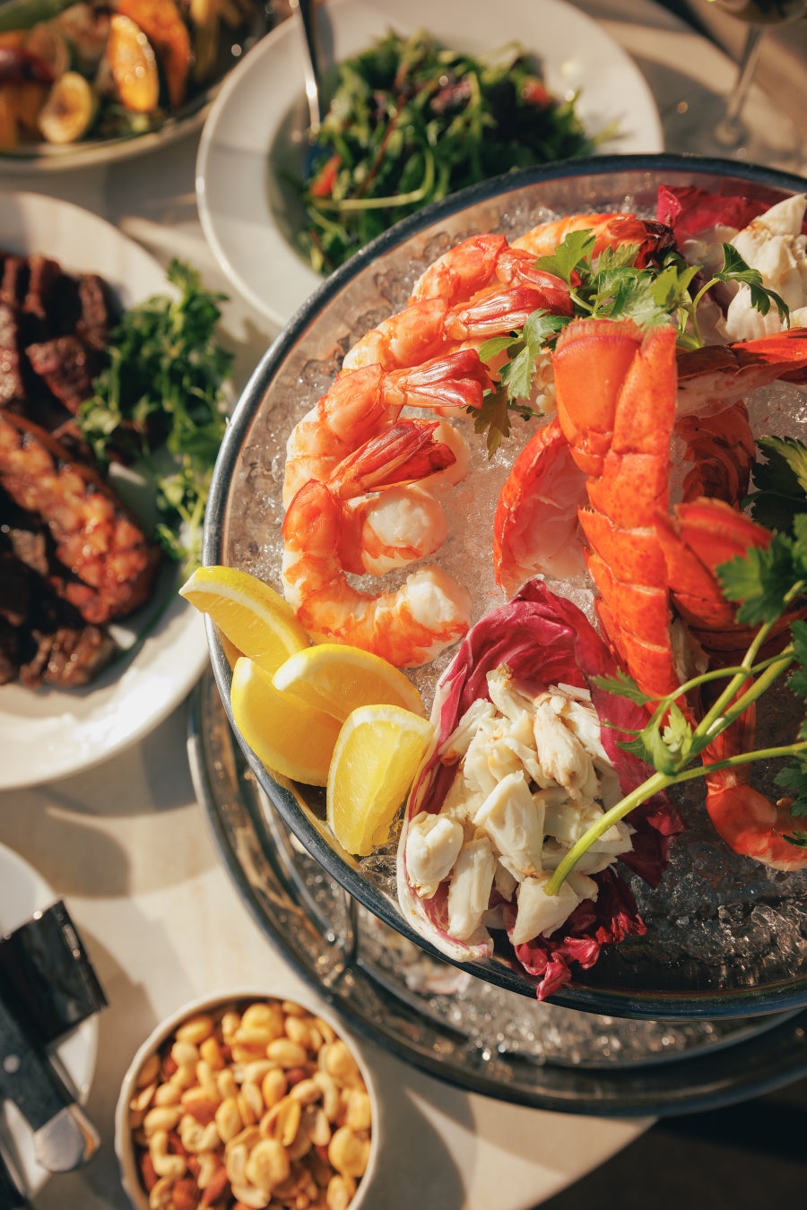 今年は4種のクラフトビールを加えた新たなフリーフローを導入し、訪れるたびに異なる味わいに出会える遊び心ある仕掛けです。さらに、カナダ産ロブスターテールや米崎(岩手県)、虫明(岡山県)、五島(長崎県)、室津(兵庫県)などから時期に合わせて仕入れるオイスター、シュリンプ、クラブミートを盛り込んだ華やかなシーフードプレートで、テラスの開放感にふさわしいダイナミックな一皿に仕上げました。USDAプライムビーフを使用したステーキバイツなど、ベンジャミン ステーキハウスならではの肉料理もラインナップしました。