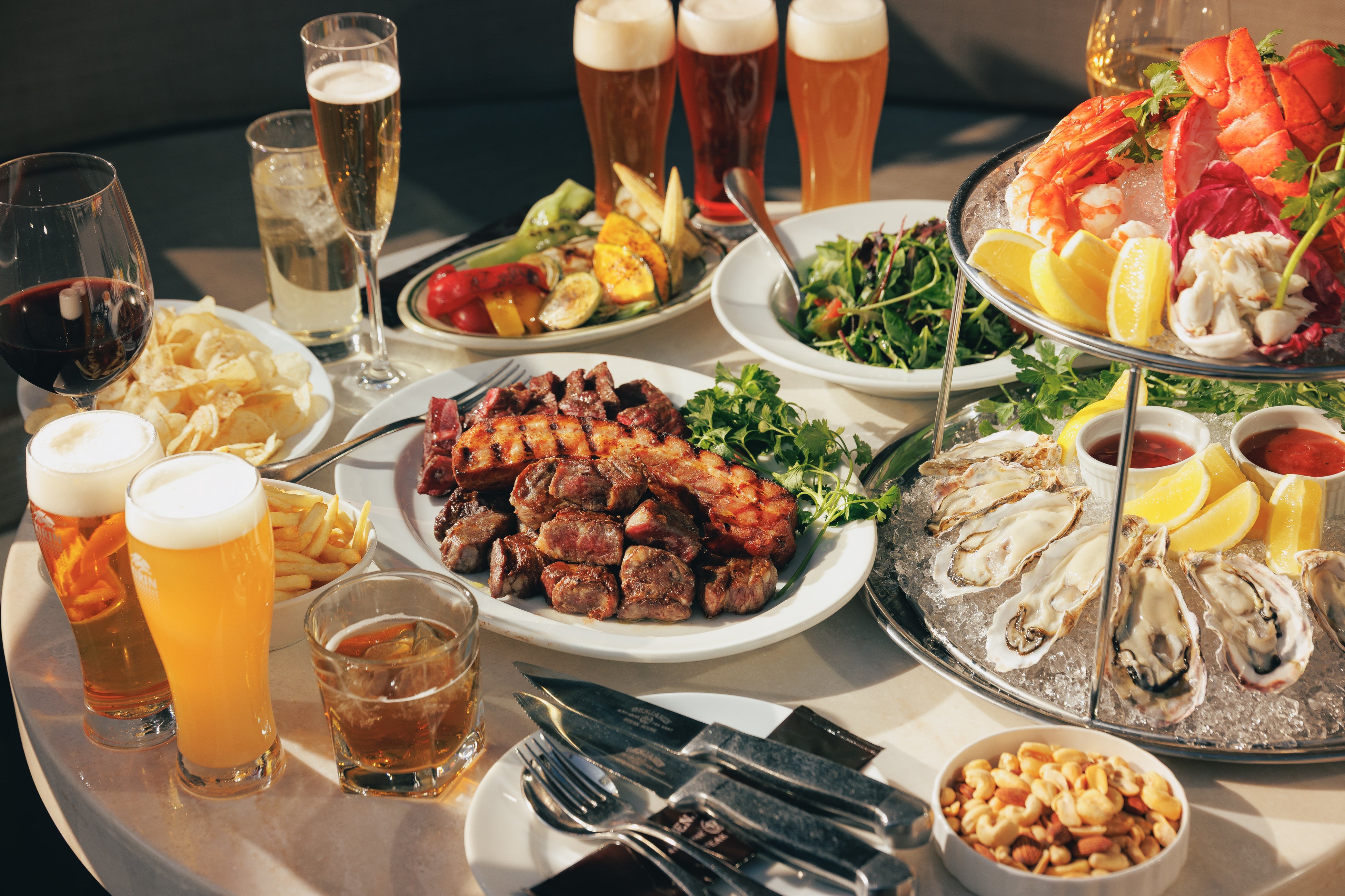 今年は4種のクラフトビールを加えた新たなフリーフローを導入し、訪れるたびに異なる味わいに出会える遊び心ある仕掛けです。さらに、カナダ産ロブスターテールや米崎(岩手県)、虫明(岡山県)、五島(長崎県)、室津(兵庫県)などから時期に合わせて仕入れるオイスター、シュリンプ、クラブミートを盛り込んだ華やかなシーフードプレートで、テラスの開放感にふさわしいダイナミックな一皿に仕上げました。USDAプライムビーフを使用したステーキバイツなど、ベンジャミン ステーキハウスならではの肉料理もラインナップしました。