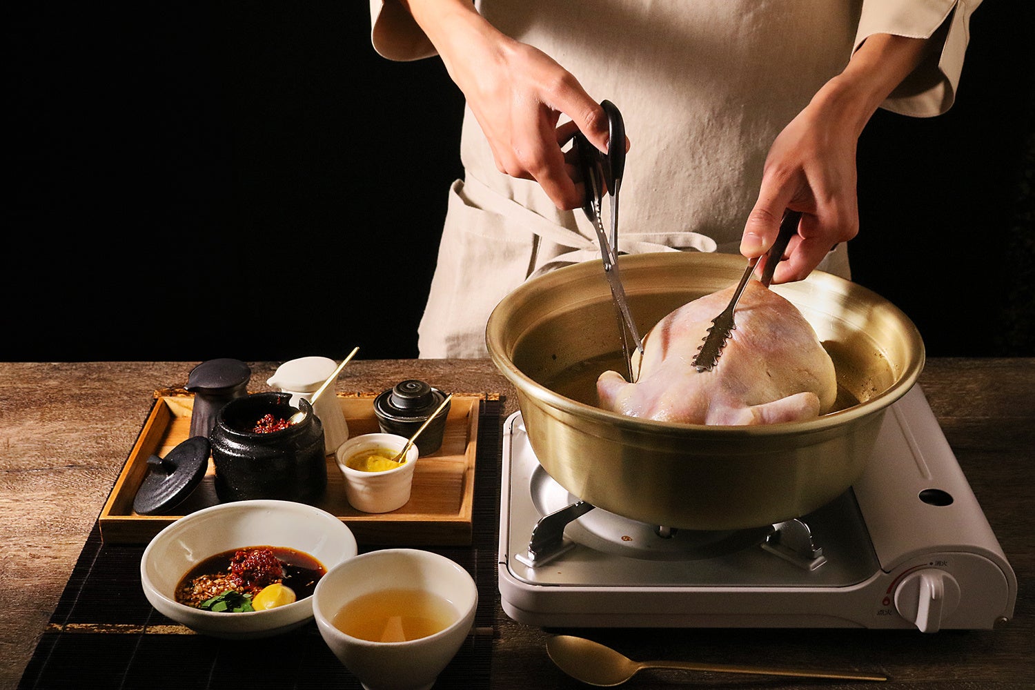こだわりの極上スープが自慢の国産丸鶏タッカンマリ食べ放題のコースは、自家製のタデギ(辛子味噌)や韓国おかず、〆のカルグクスと雑炊など楽しみ方は様々。