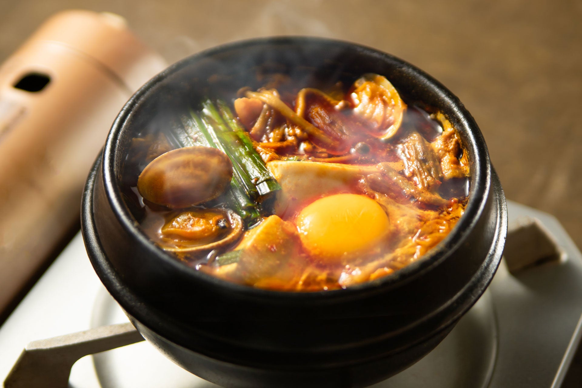 ふんわりとろける豆腐とキムチ、エノキ、アサリが旨辛スープと絶妙に絡み合う、ご飯との相性抜群な一品。