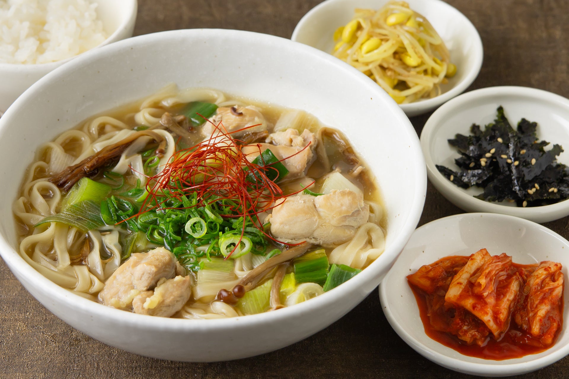 鶏肉や野菜をじっくり煮込んだスープの韓国風鶏うどん。