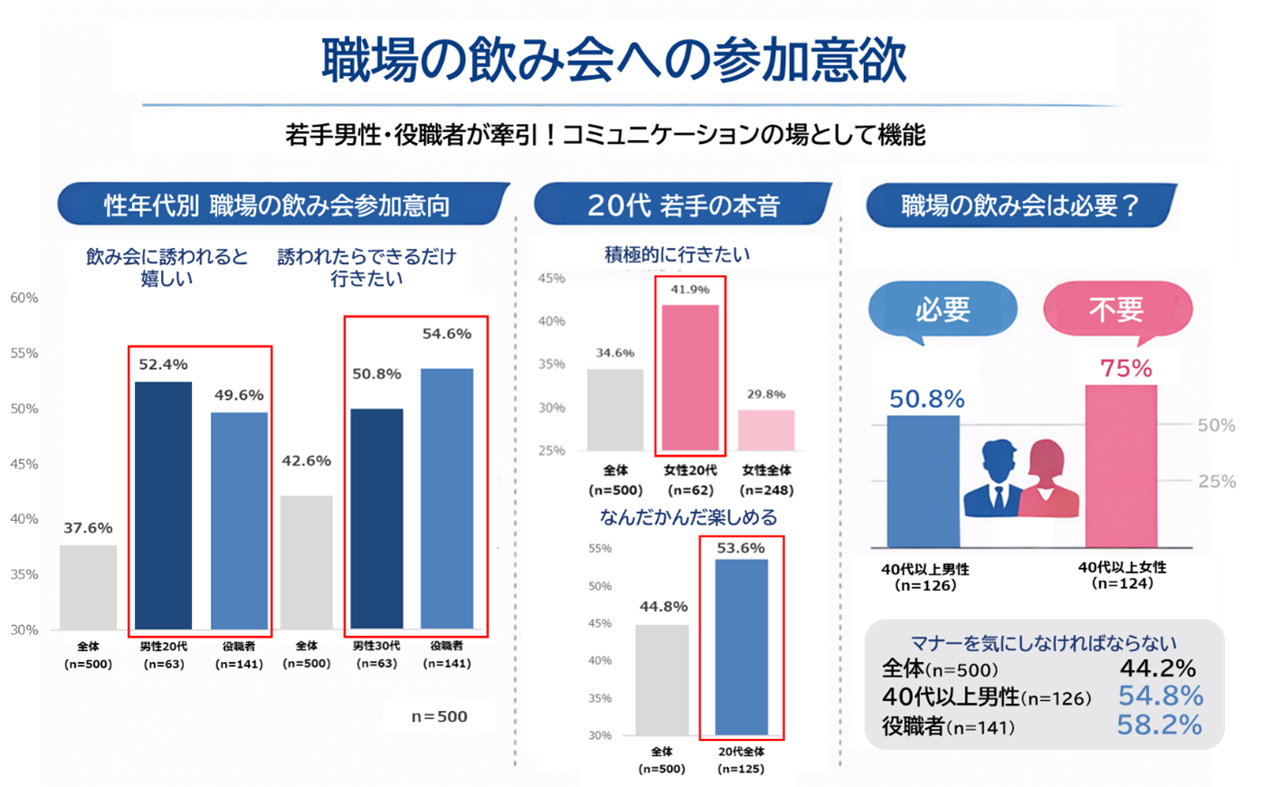職場の飲み会は若手男性・役職者が牽引!コミュニケーションの場として機能