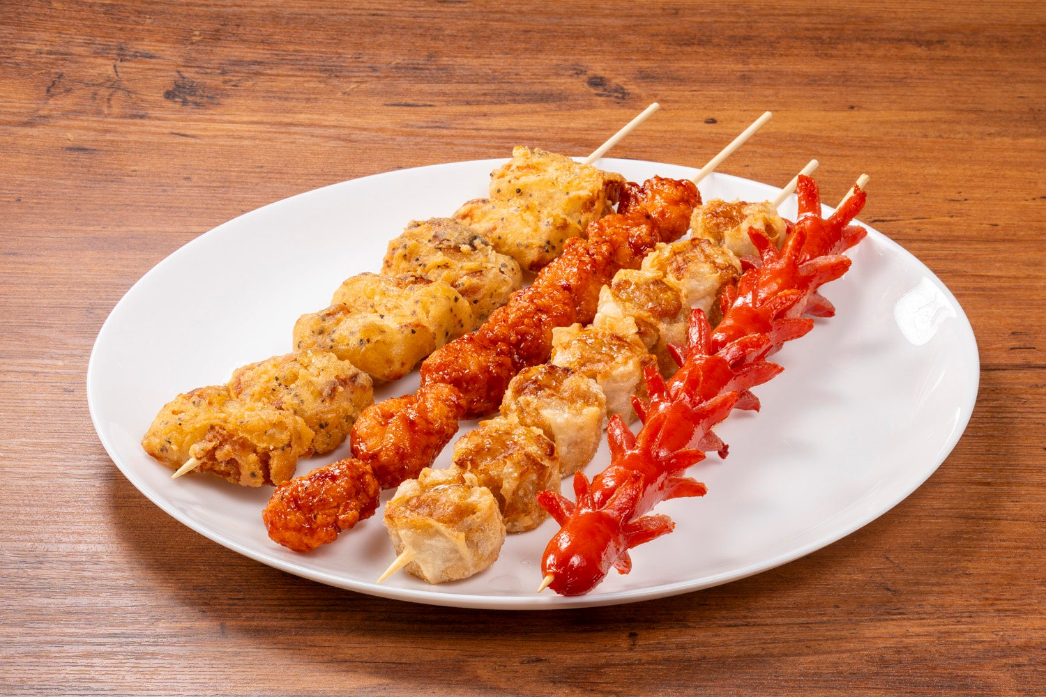タコさん串、シュウマイ串、ヤンニョムチキン串、スパイシーちくわ天ぷら串の4本セット