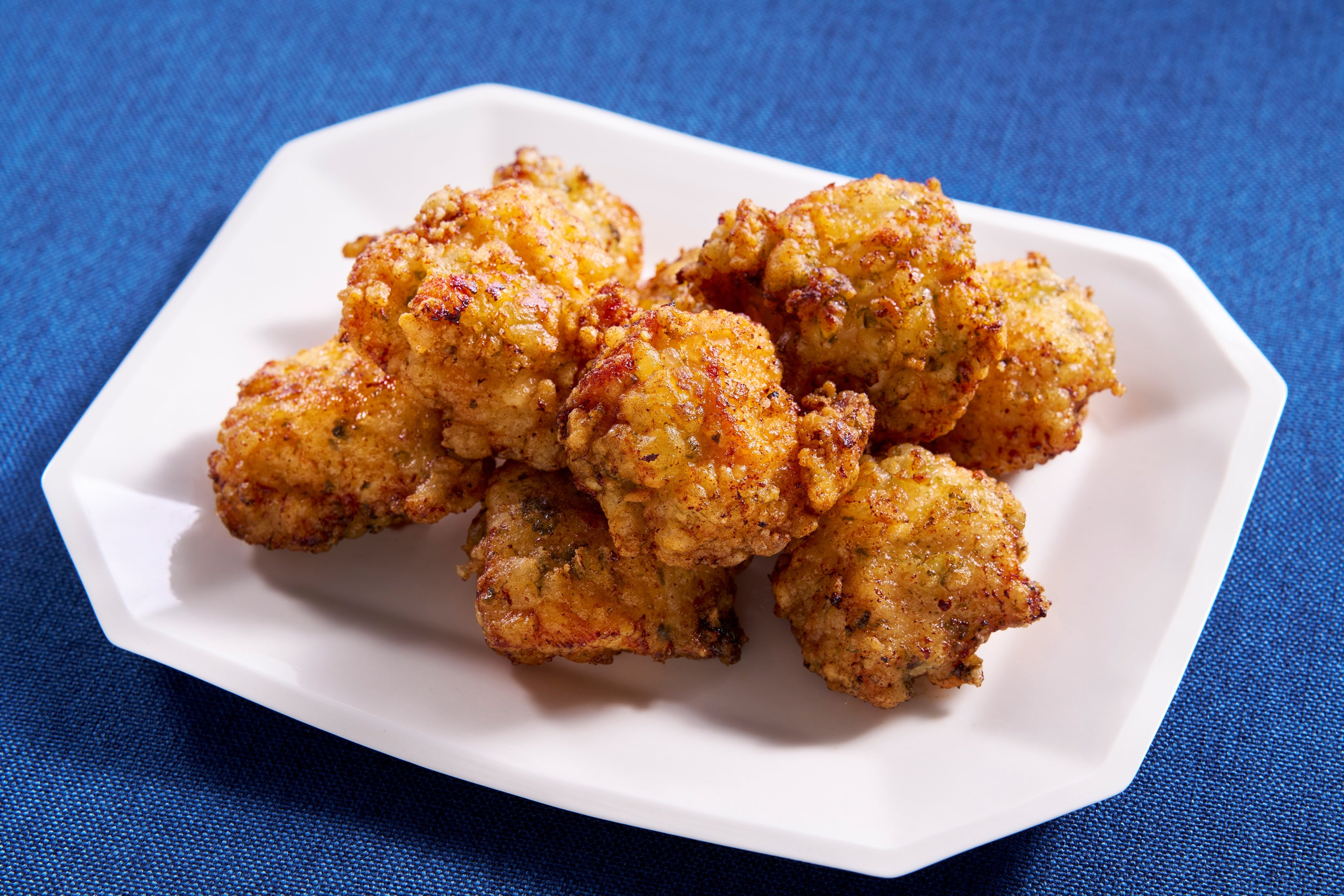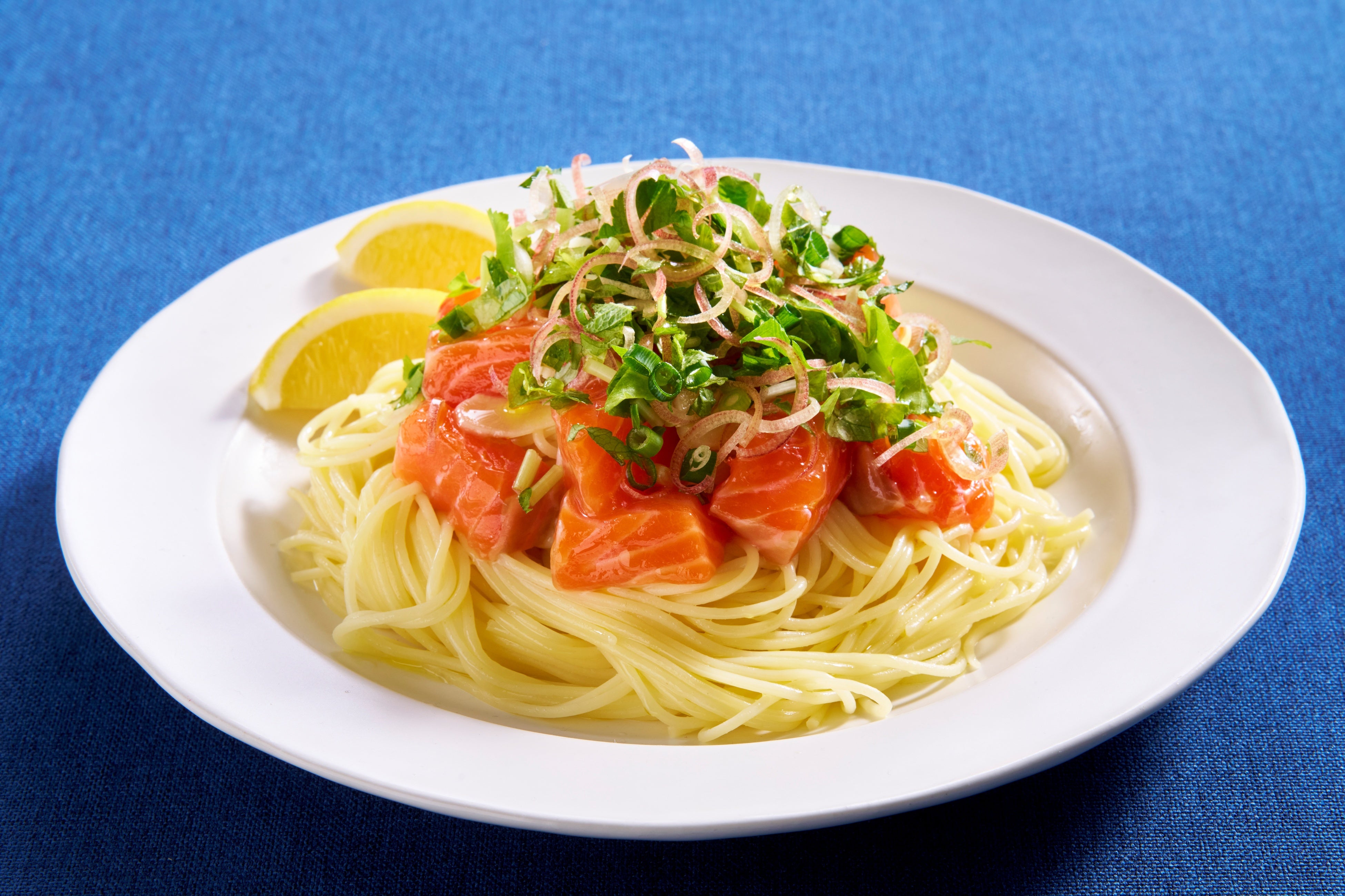 パッケージと同じ、青色のエプロンに身を包んだ和田明日香さん。「液体塩こうじ」を使用した和田さん考案の3つのメニューが登場します。