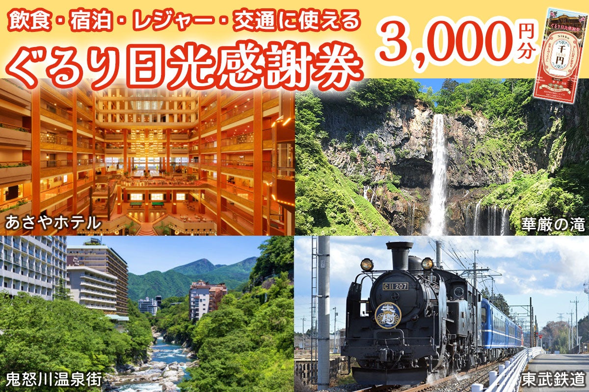 日光市内参加店での宿泊・店内飲食・レジャー・アクティビティ・市内の交通料金などに幅広くお使いいただける商品券です。