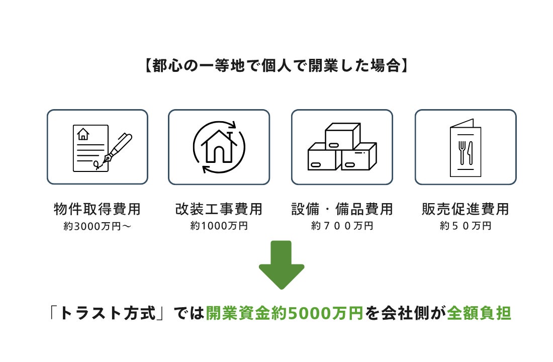 一般的に飲食店の独立には、物件取得や内外装費など多額の初期投資が必要となる。一方、トラスト方式では料理人が開業費用0円で独立することが可能である。