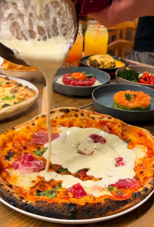 とろ〜り溢れる、黄金の絶景。窯焼きピッツァや選べる逸品に、濃厚なとろとろチーズを贅沢に注ぎ込む至福の体験を