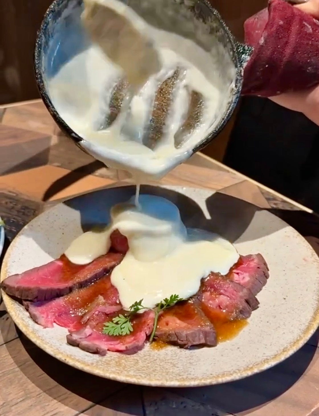 【圧倒的な視覚体験】目の前で仕上げる「黄金のチーズシャワー」