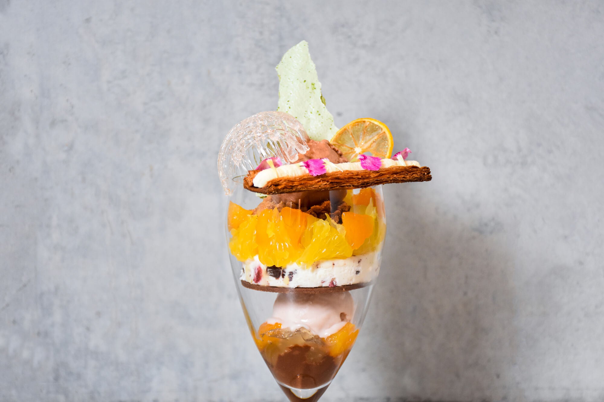ジューシーな旬の甘夏みかんと清見オレンジ、そして香り豊かなチョコレートを主役に据え、全15パーツが幾層にも重なり合う贅沢なパフェが完成しました。