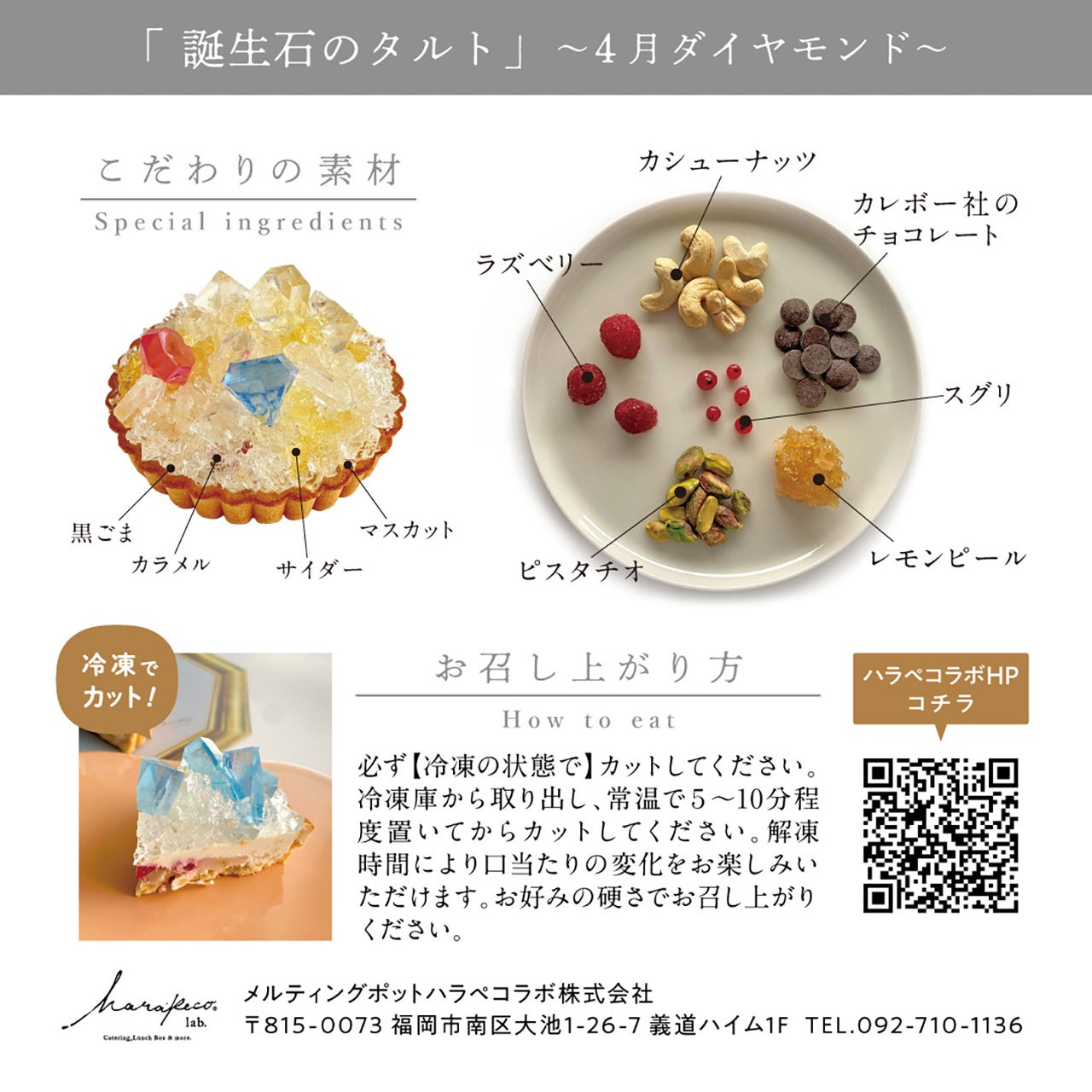「ArtなFoodであそぶ」をテーマにプロダクトを展開するメルティングポットハラペコラボ株式会社(所在地:福岡県福岡市、以下 ハラペコラボ)から、4月の誕生石ダイヤモンドを切りたての琥珀糖の輝きで表現した【誕生石のタルト〜4月ダイヤモンド〜】が数量限定で登場。ひとつひとつ職人が切り出す、まるで宝石のようなアイスケーキです。公式オンラインストアにて、2026年3月26日正午より販売開始いたします。
