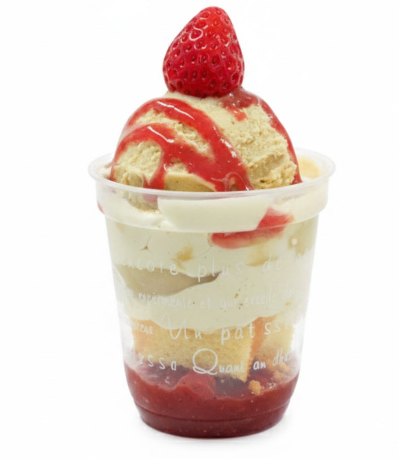 甘酸っぱいピーチいちごソースをトッピング。スポンジも入っていてショートケーキのような味わいになります。