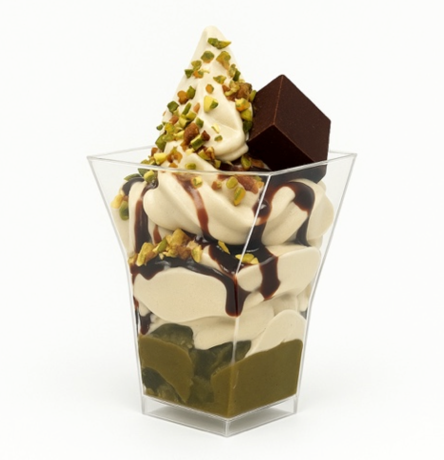 ピスタチオソフトに、ドバイチョコの特徴であるザクザク食感のカダイフとピスタチオペースト、さらにブラウニーチョコソースを合わせています。